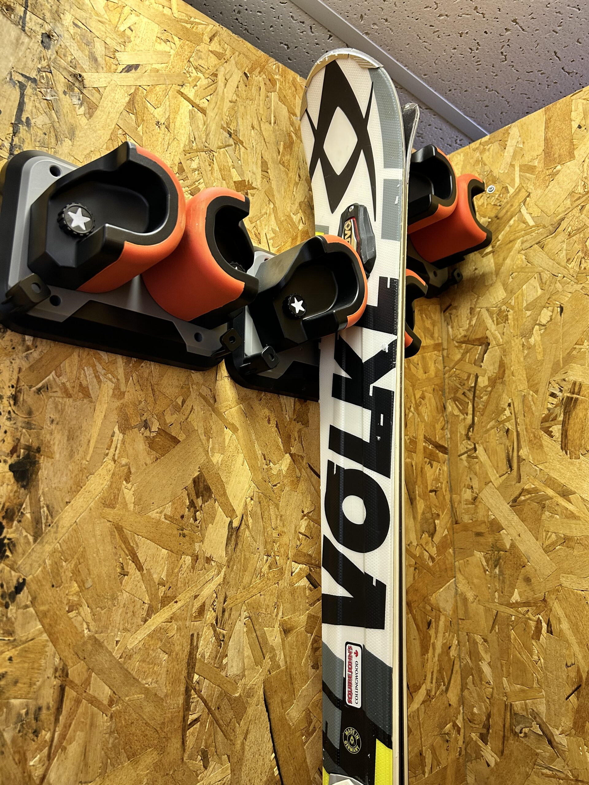 Cleaso good quality hangers for 3 pairs of skis and one snowboard that all fits perfectly in a large locker at Alpine.
