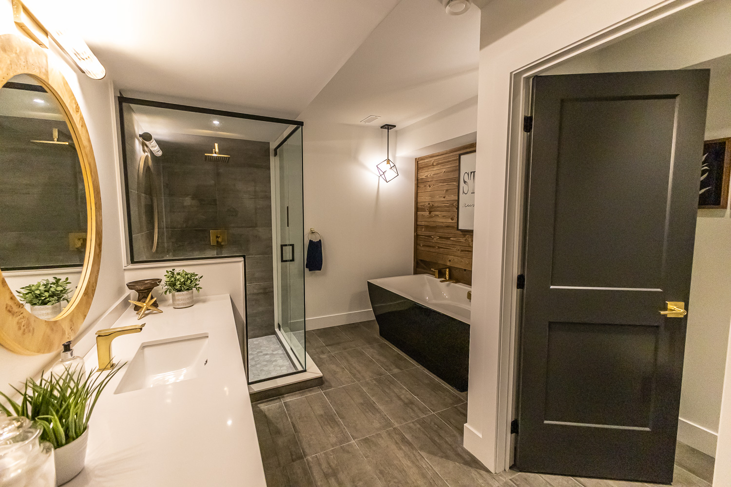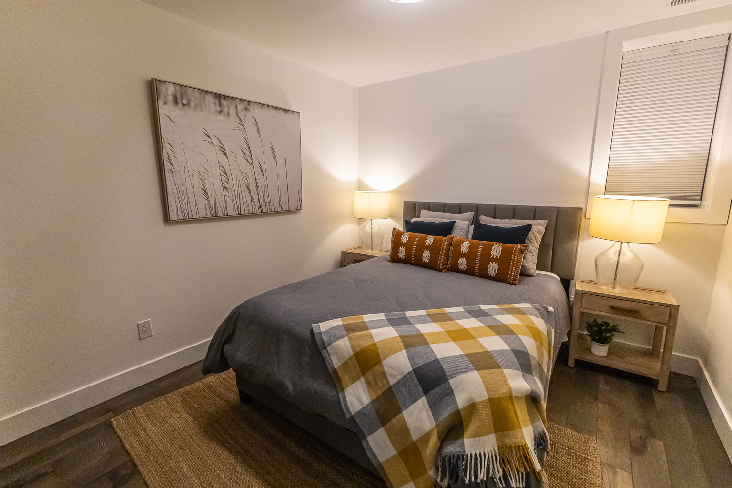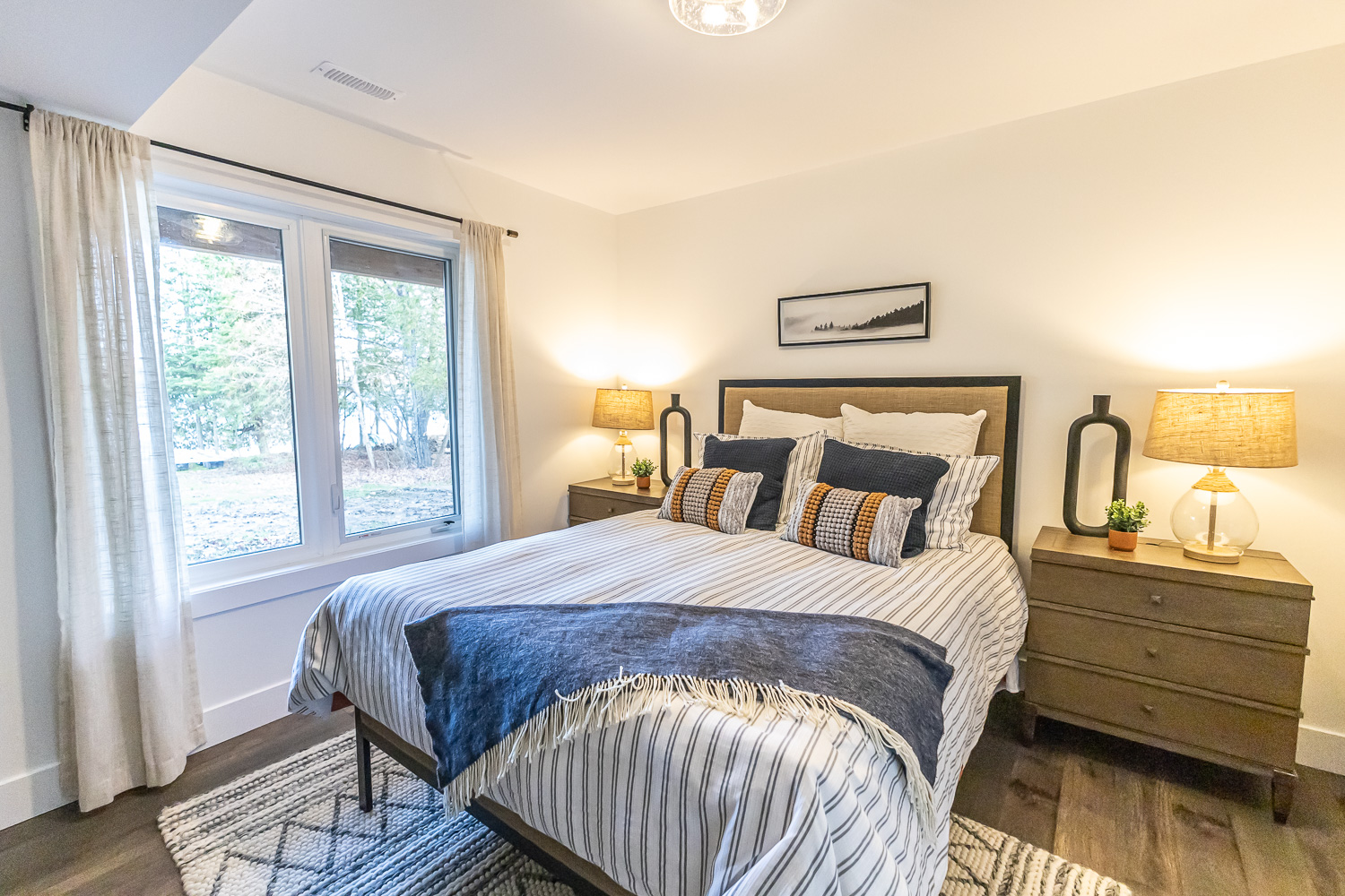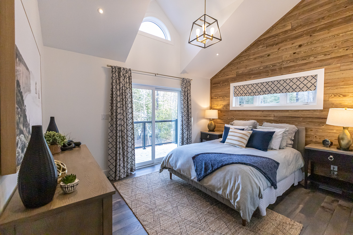 The primary suite offers a private, hotel-inspired experience with vaulted ceilings, a spa-like ensuite, and a semi-private outdoor seating area. Additional bedrooms and a fully finished lower level provide ample space for family and guests, including a secondary living area with walkout access to the lake and grounds.