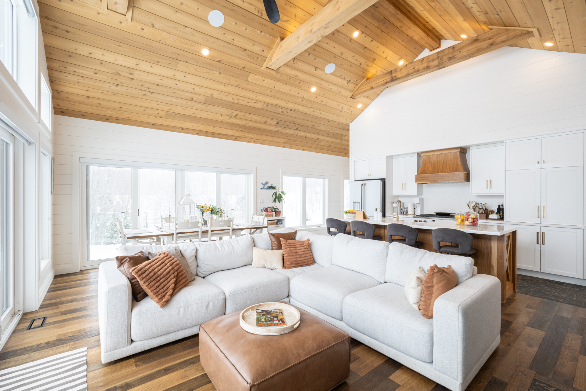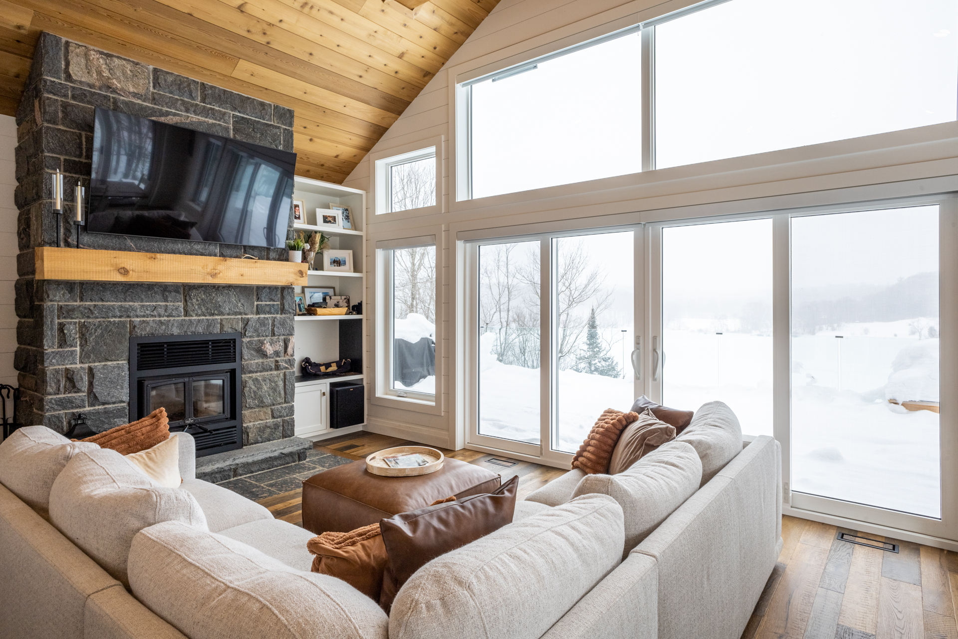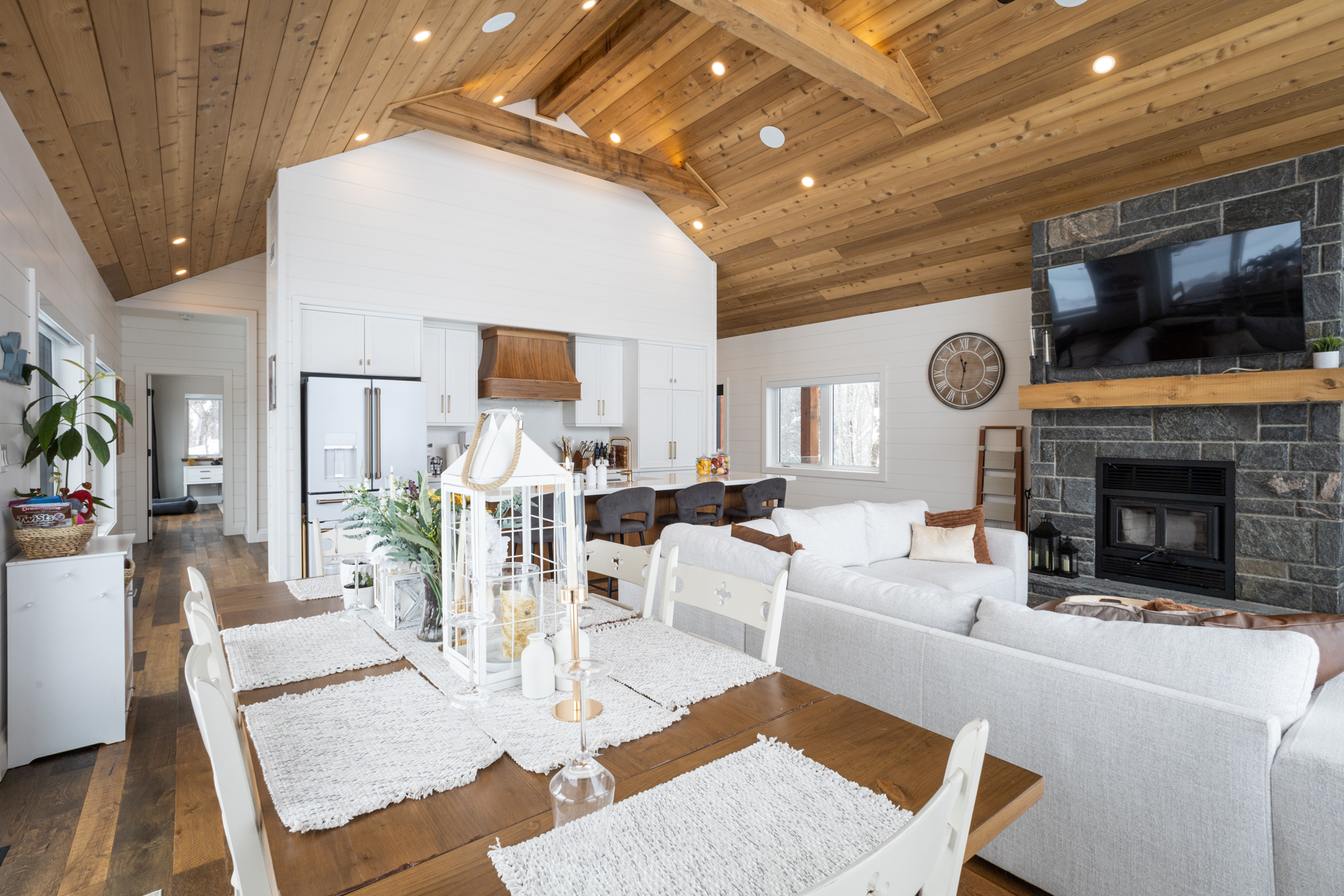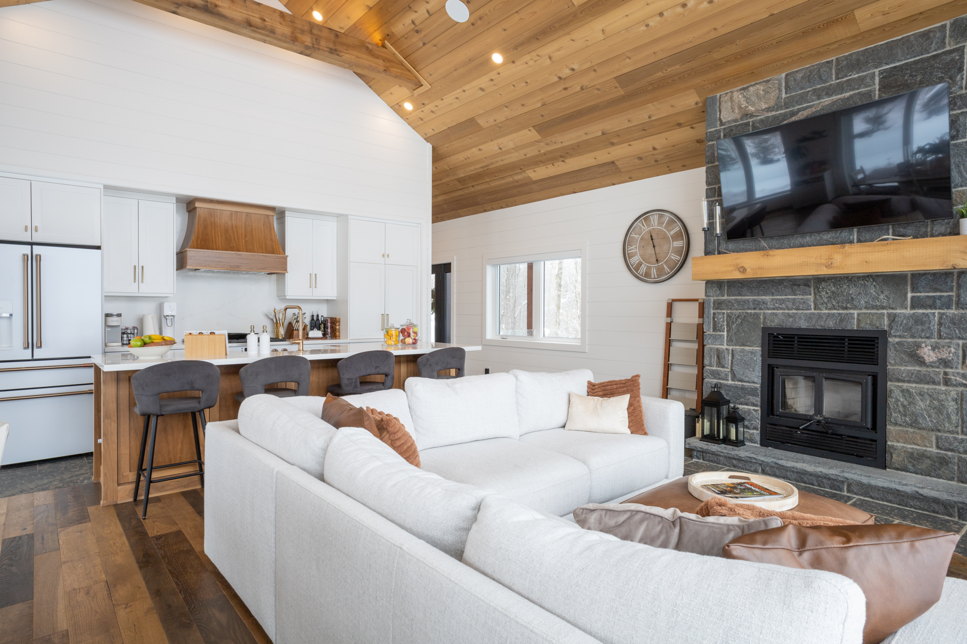 Inside, the home features three well-appointed bedrooms — including one king and two queen accommodations — along with 2.5 bathrooms, making it perfectly suited for up to eight guests. The open and inviting living space is anchored by a fireplace and complemented by modern comforts including WiFi, smart TVs, and a fully equipped kitchen with premium appliances. Whether preparing meals, enjoying quiet mornings, or gathering after a day outdoors, the home is designed for effortless seasonal living.
