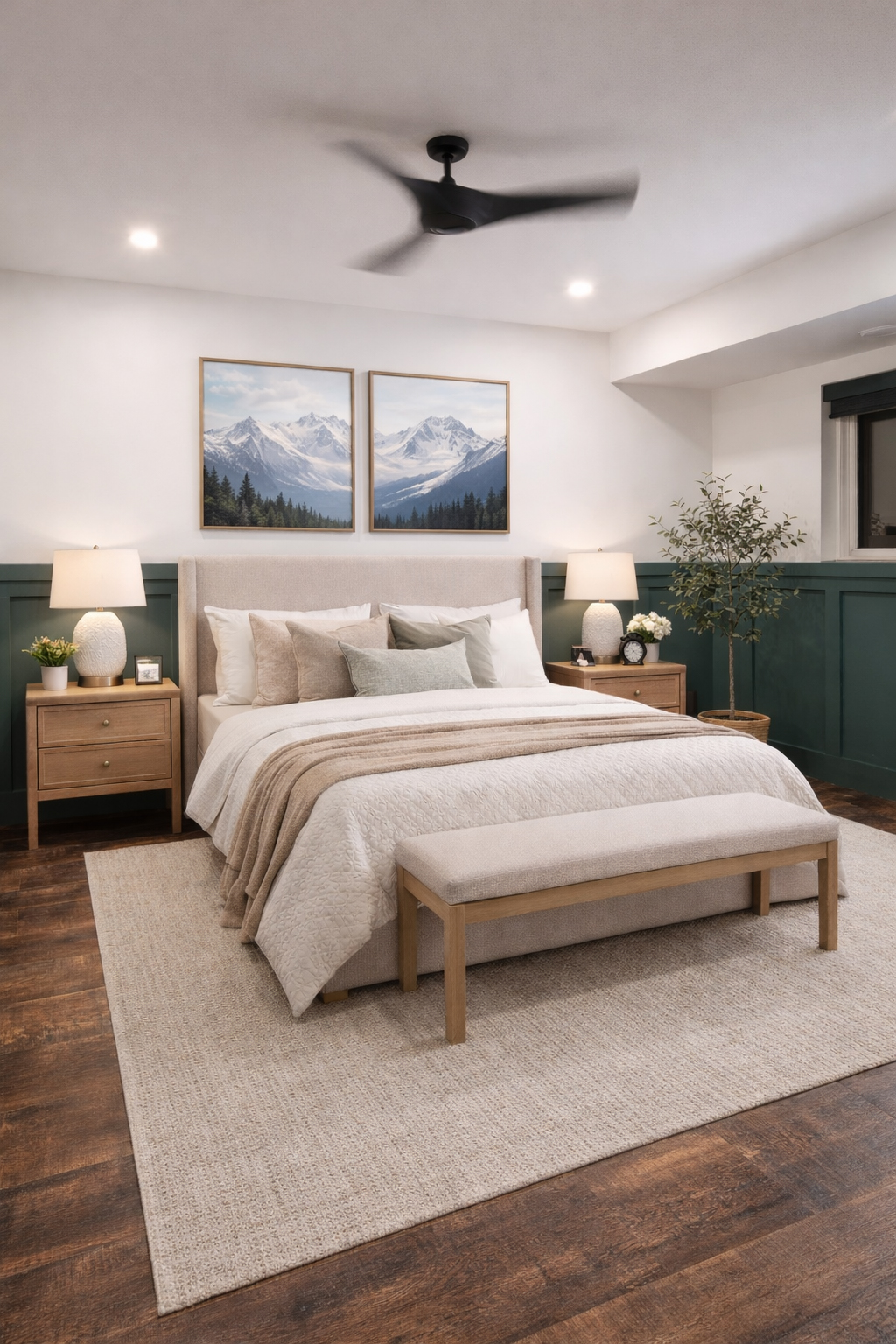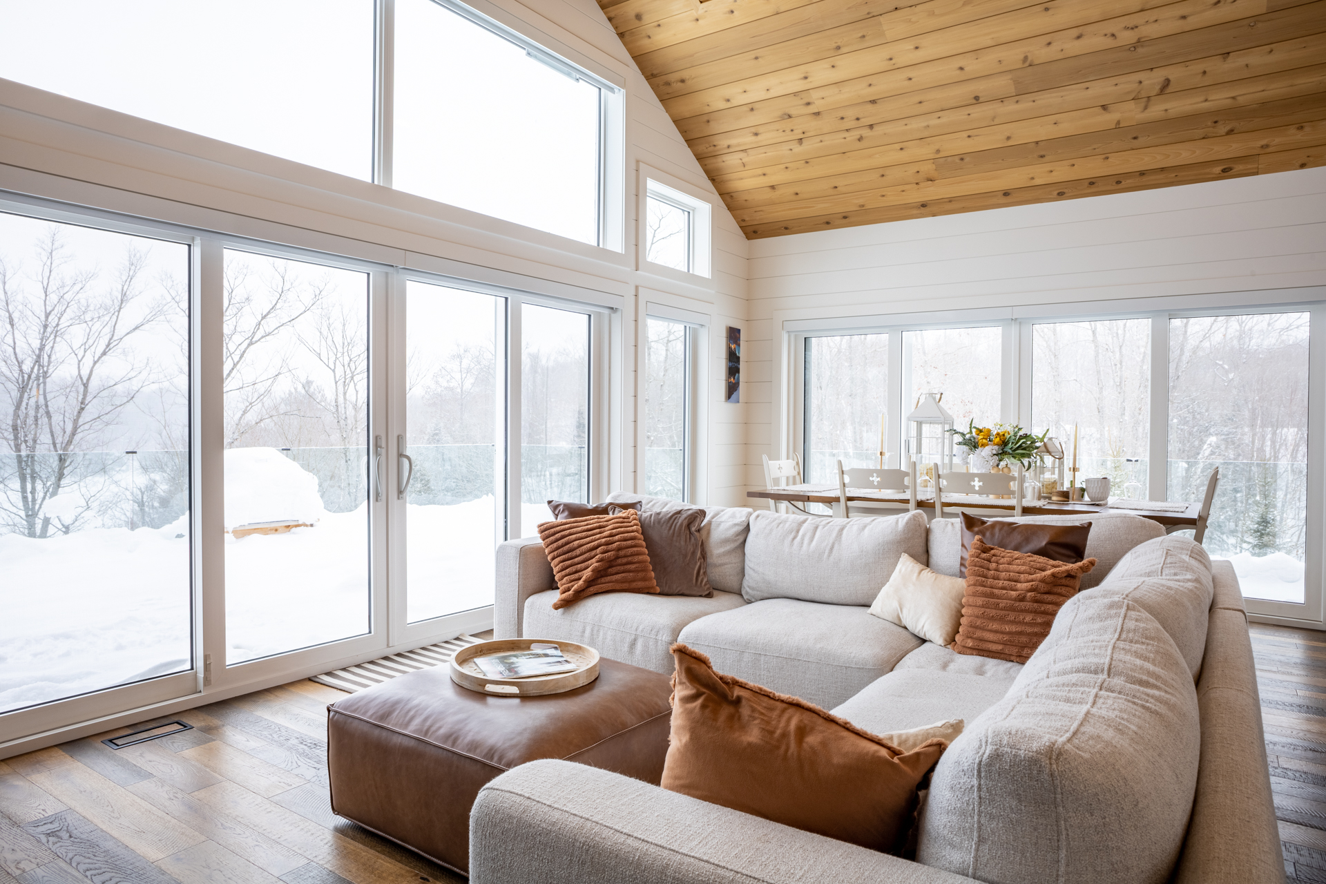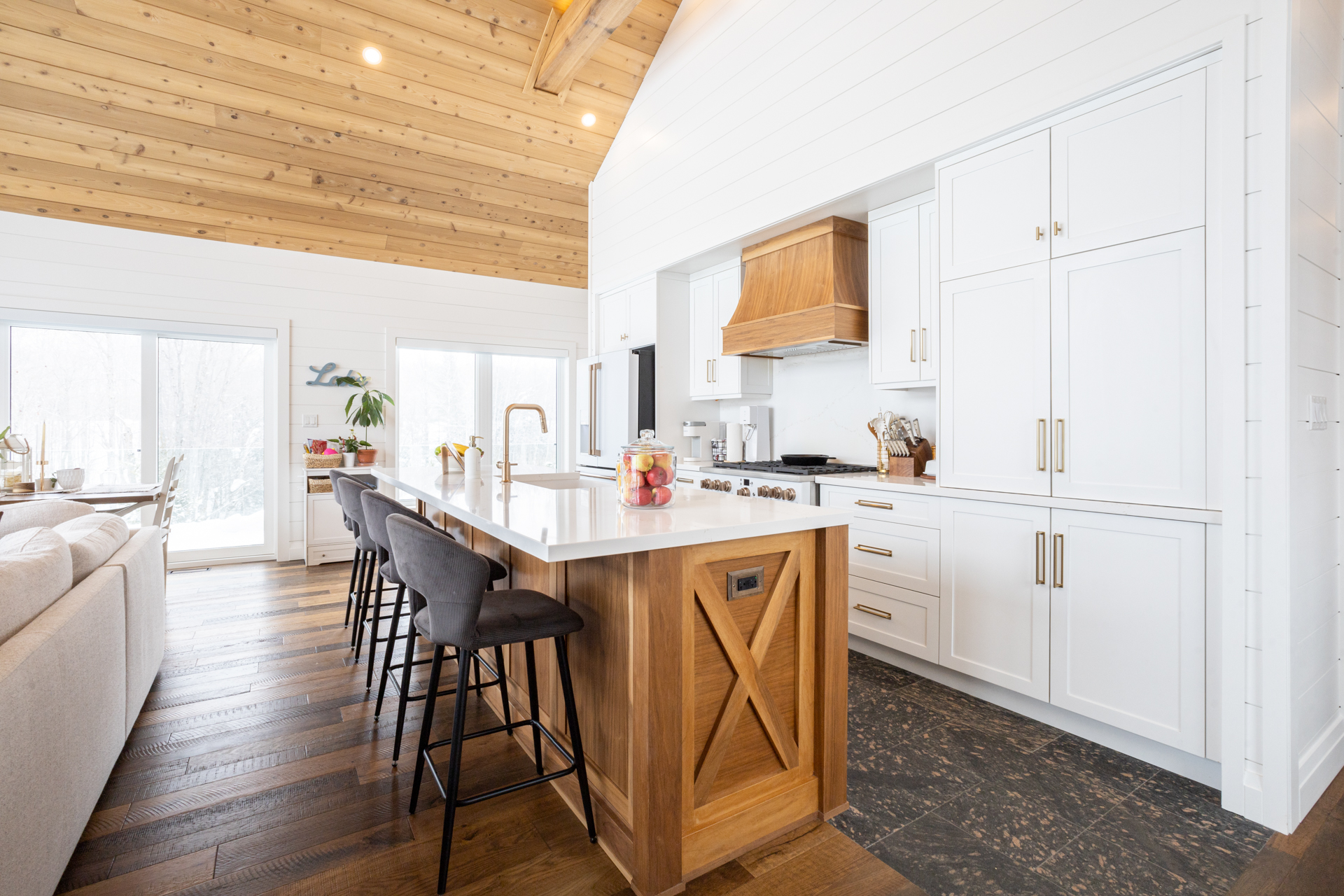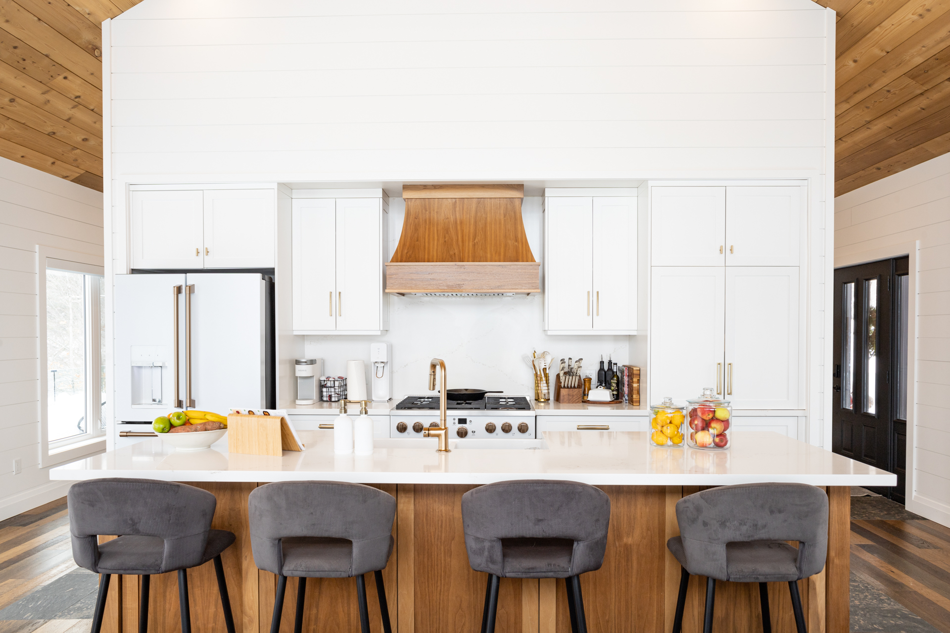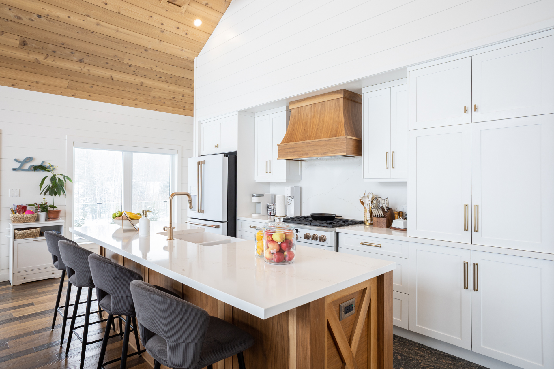 Inside, the home features three well-appointed bedrooms — including one king and two queen accommodations — along with 2.5 bathrooms, making it perfectly suited for up to eight guests. The open and inviting living space is anchored by a fireplace and complemented by modern comforts including WiFi, smart TVs, and a fully equipped kitchen with premium appliances. Whether preparing meals, enjoying quiet mornings, or gathering after a day outdoors, the home is designed for effortless seasonal living.