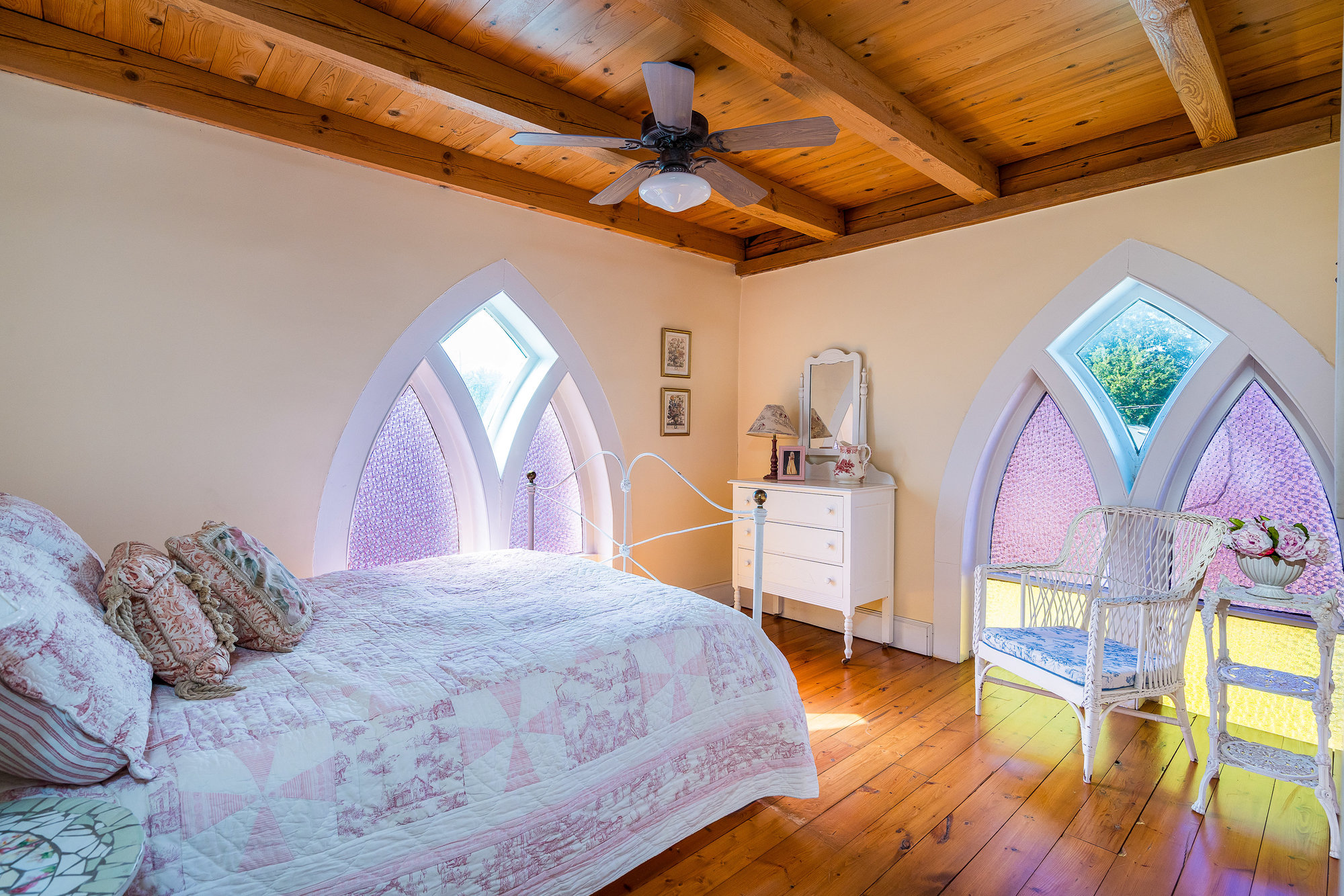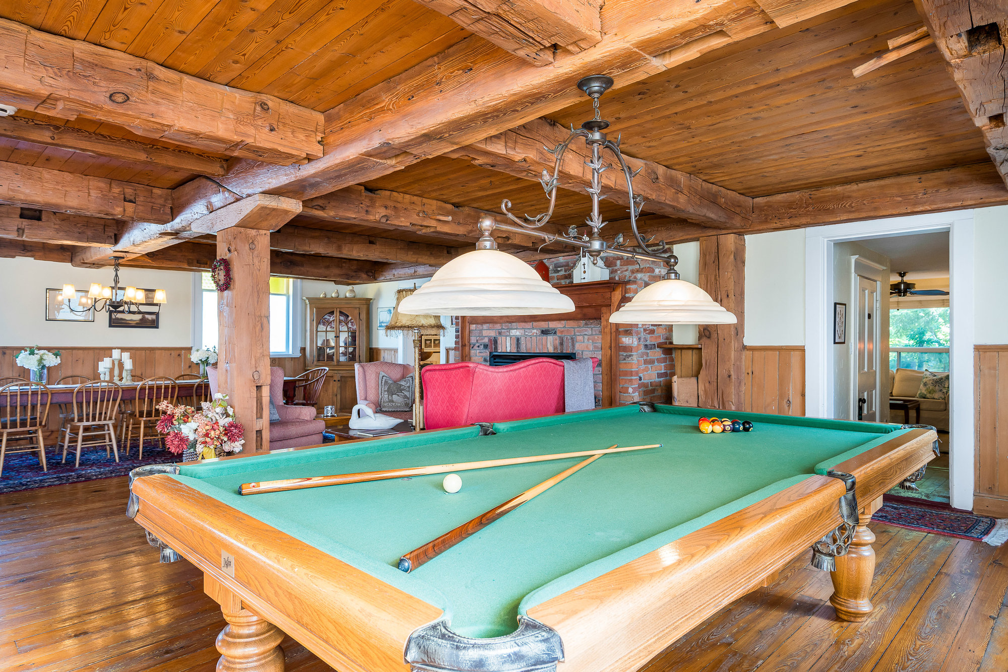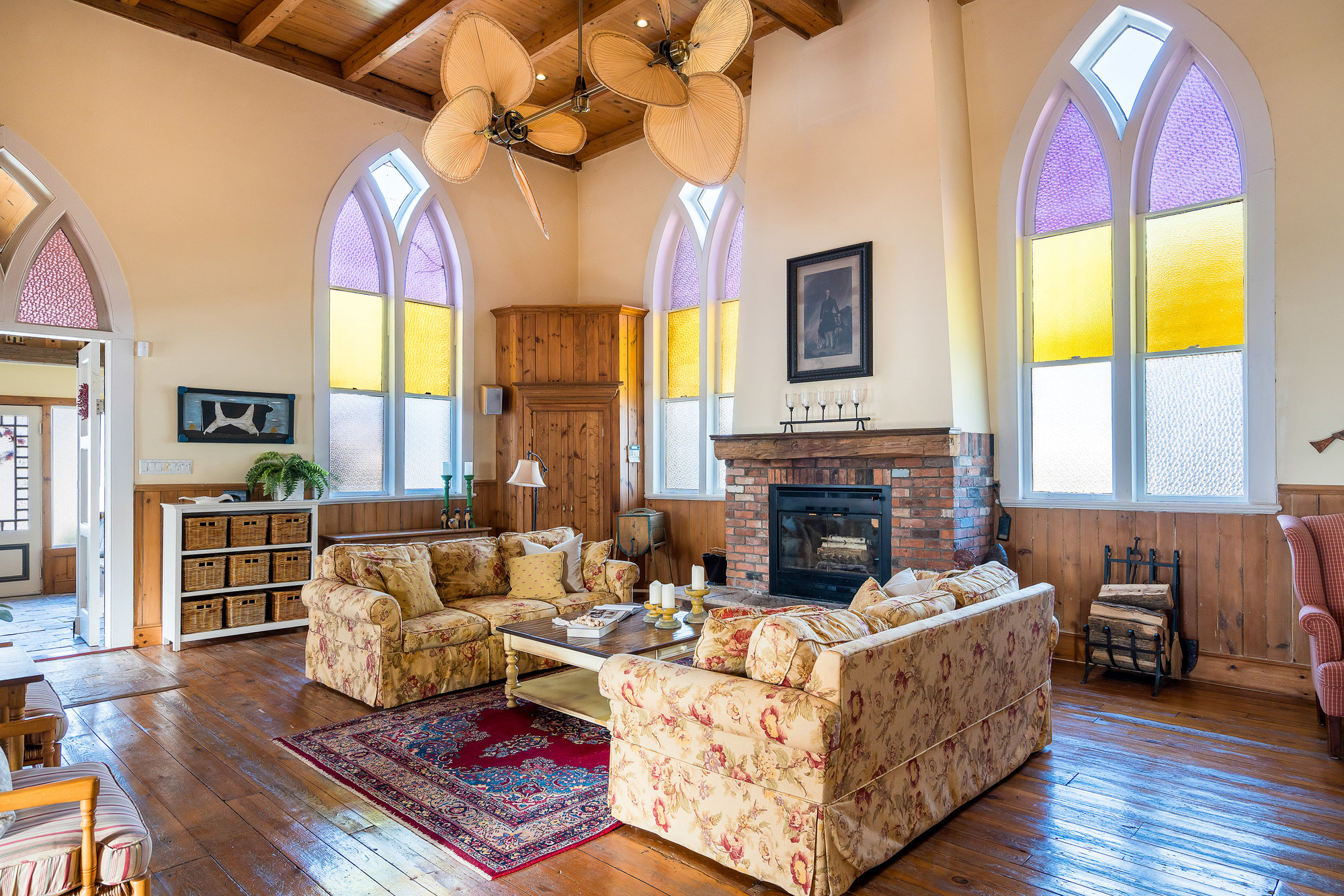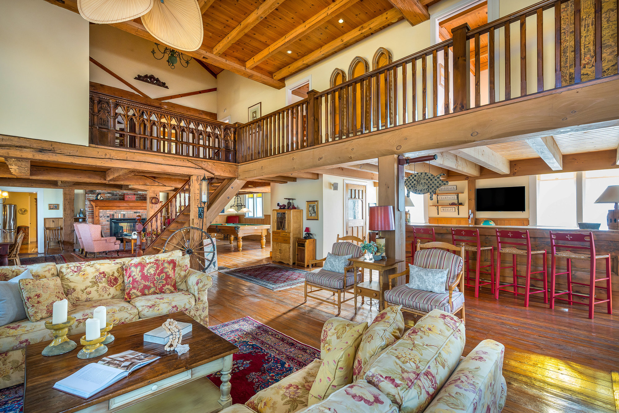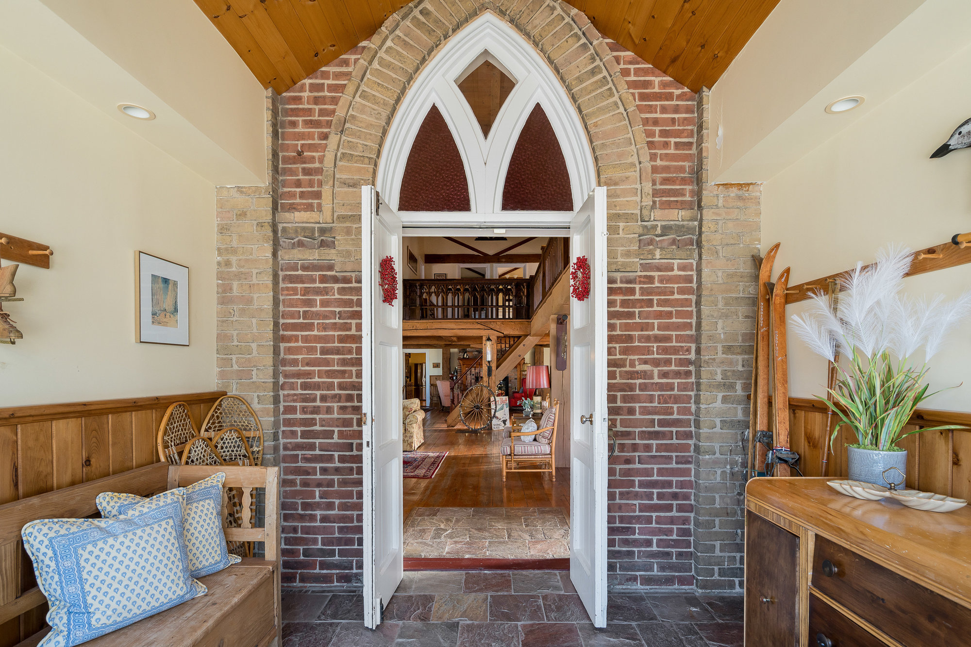 When you step inside this unique, renovated 1897 church, you can’t help but imagine the fabulous holidays your family and friends would enjoy here. On the main street of the charming village of Nottawa, this is a home meant for gathering. This rare opportunity is absolutely full of thoughtful touches and decor lavished on it by its current owners, and all those touches are included in the sale. Furnishings, linens, rugs, art, lamps, antiques, even the dishes, all come with the house so moving in will be easy. Your family will enjoy the restful and restorative atmosphere of the main floor with the soft light of stained glass. The sprawling living space under post and beam cathedral ceilings has a chalet like feel. It features a primary seating area in front of a wood burning fireplace with a wonderful long and welcoming bar for entertaining. The bar itself was recovered from an old general store. An adjoining space houses another seating area in front of a gas fireplace and a large billiards table. The dining table seats 14 so no card tables will be necessary. Each space is wide open yet beautifully defined with a combination of historic details and new improvements. You will have room for all your guests in the five upstairs bedrooms, all stylishly decorated and all enjoying the comforting glow of stained glass windows.The main floor den has a pull out sofa bed and an ensuite bathroom for additional sleeping quarters. It is a home to wander in, explore, and bask in its warmth and coziness. Outside, a large backyard deck allows space for an oversized bbq and an enormous hot tub, all under a beautiful canopy of mature trees. Multiple sheds for storage and potting make maintenance easy — and even the garden equipment is included.