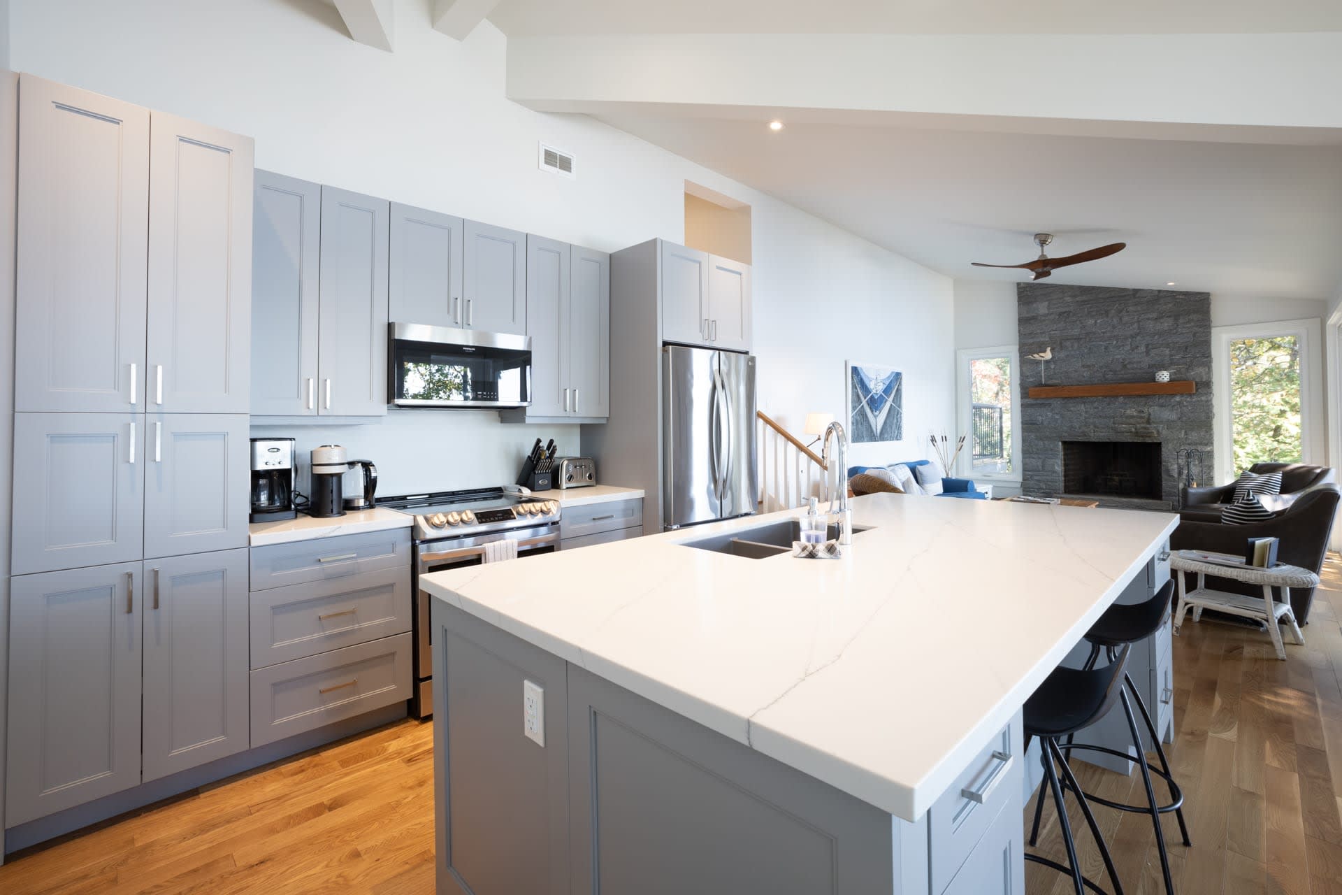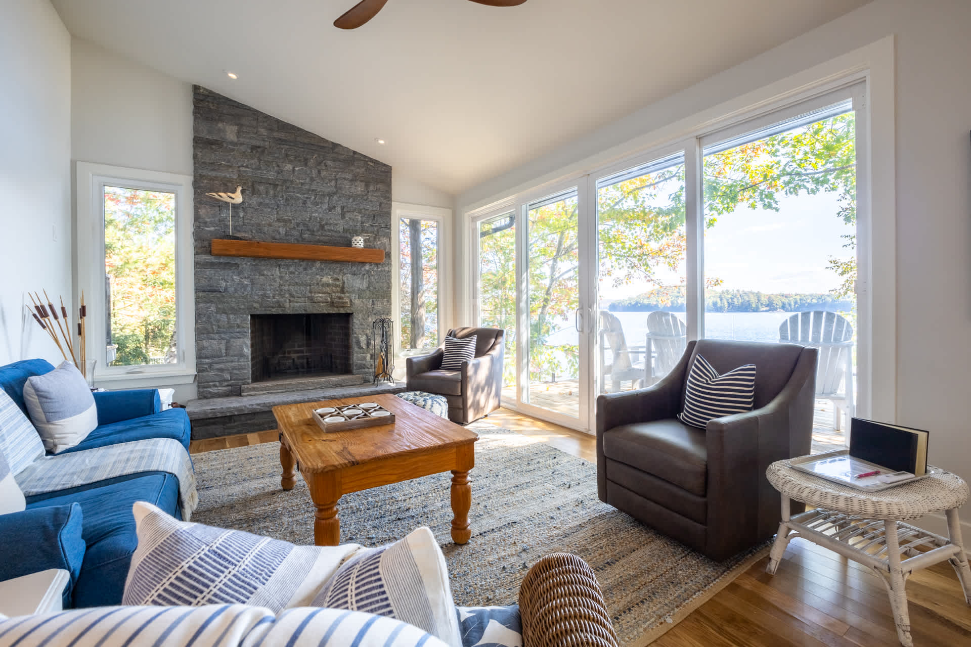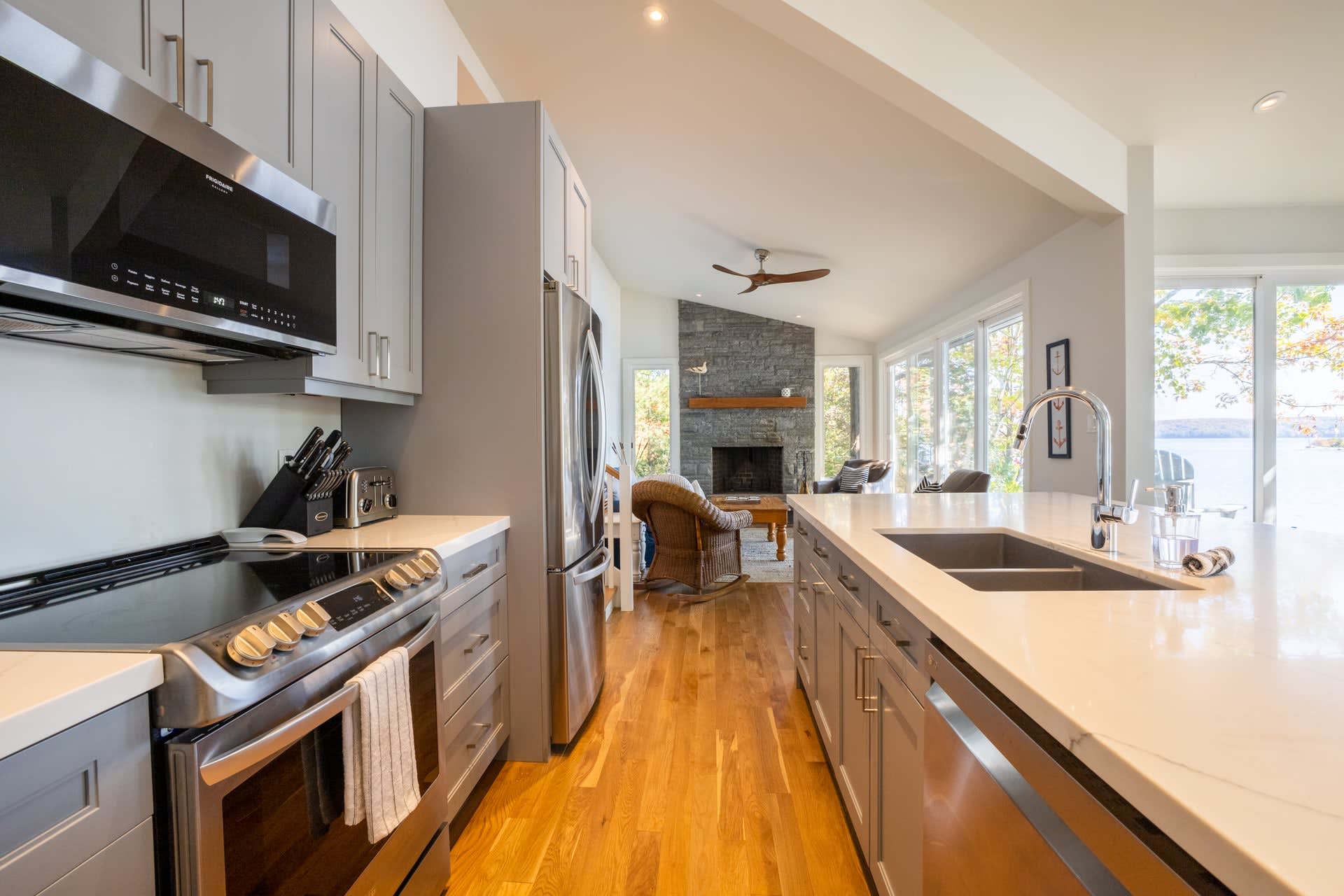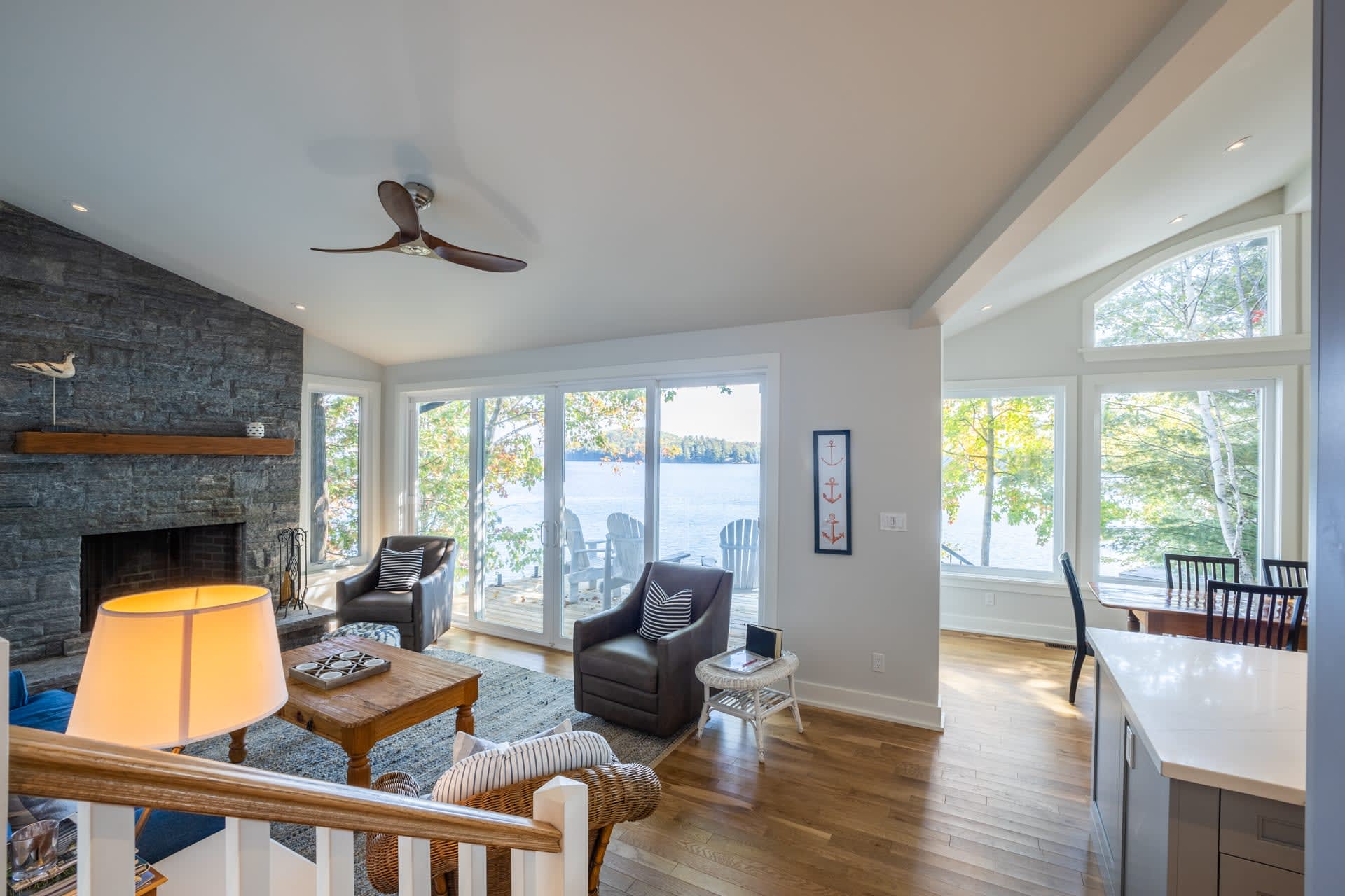 Inside, the cottage opens into a warm and inviting living space, where a wall of windows frames sweeping lake views and fills the home with natural light. A wood-burning fireplace anchors the space, creating the perfect atmosphere for relaxed evenings after a day on the water. The modern kitchen is thoughtfully designed with stainless steel appliances and a large island, making it equally suited for casual family meals or entertaining.
