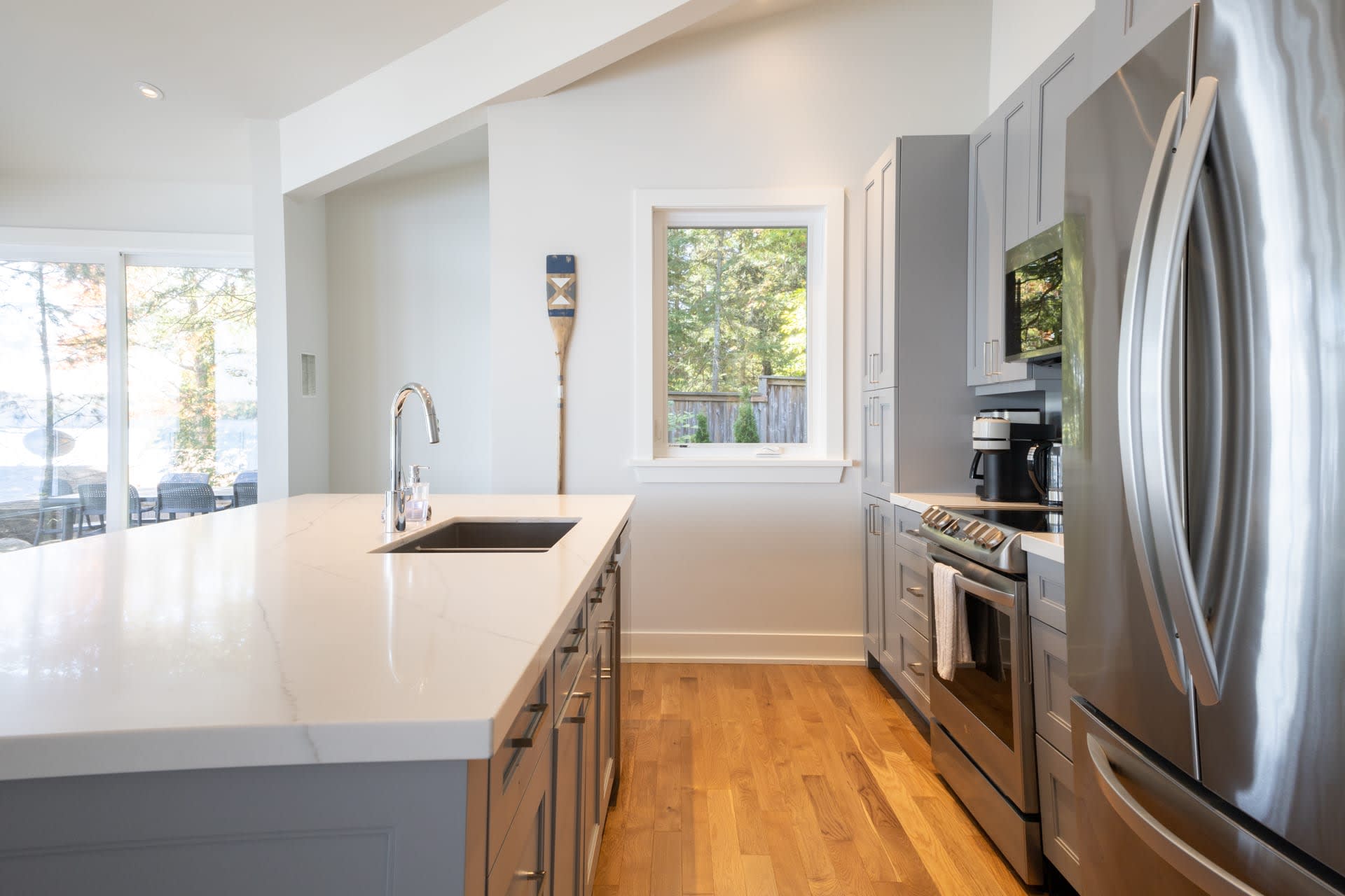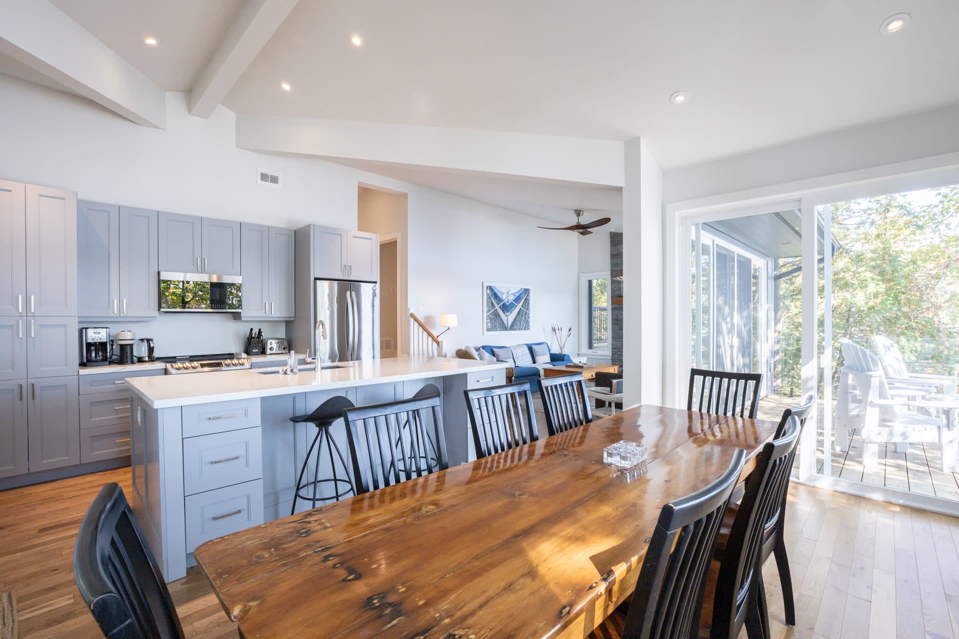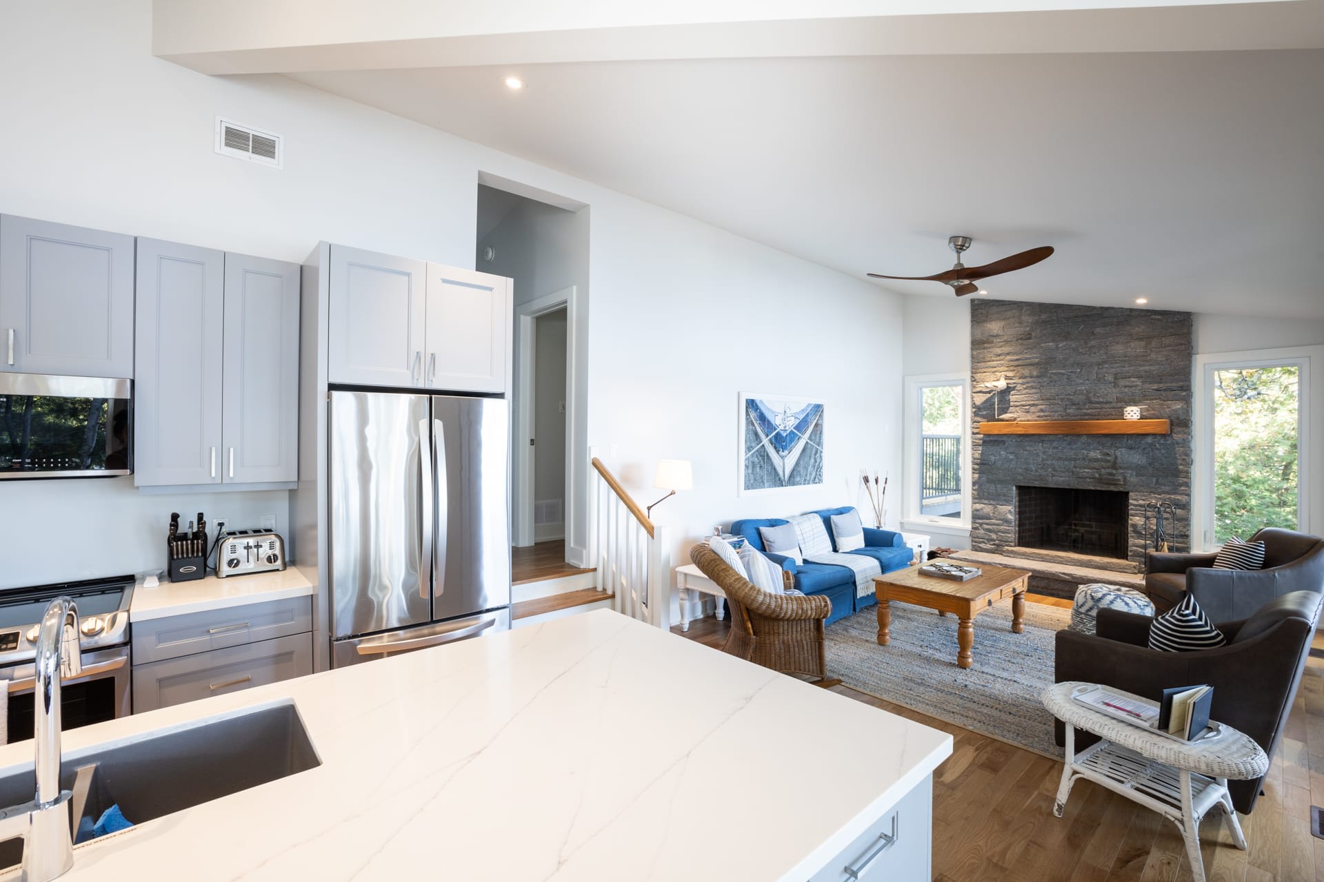 Inside, the cottage opens into a warm and inviting living space, where a wall of windows frames sweeping lake views and fills the home with natural light. A wood-burning fireplace anchors the space, creating the perfect atmosphere for relaxed evenings after a day on the water. The modern kitchen is thoughtfully designed with stainless steel appliances and a large island, making it equally suited for casual family meals or entertaining.