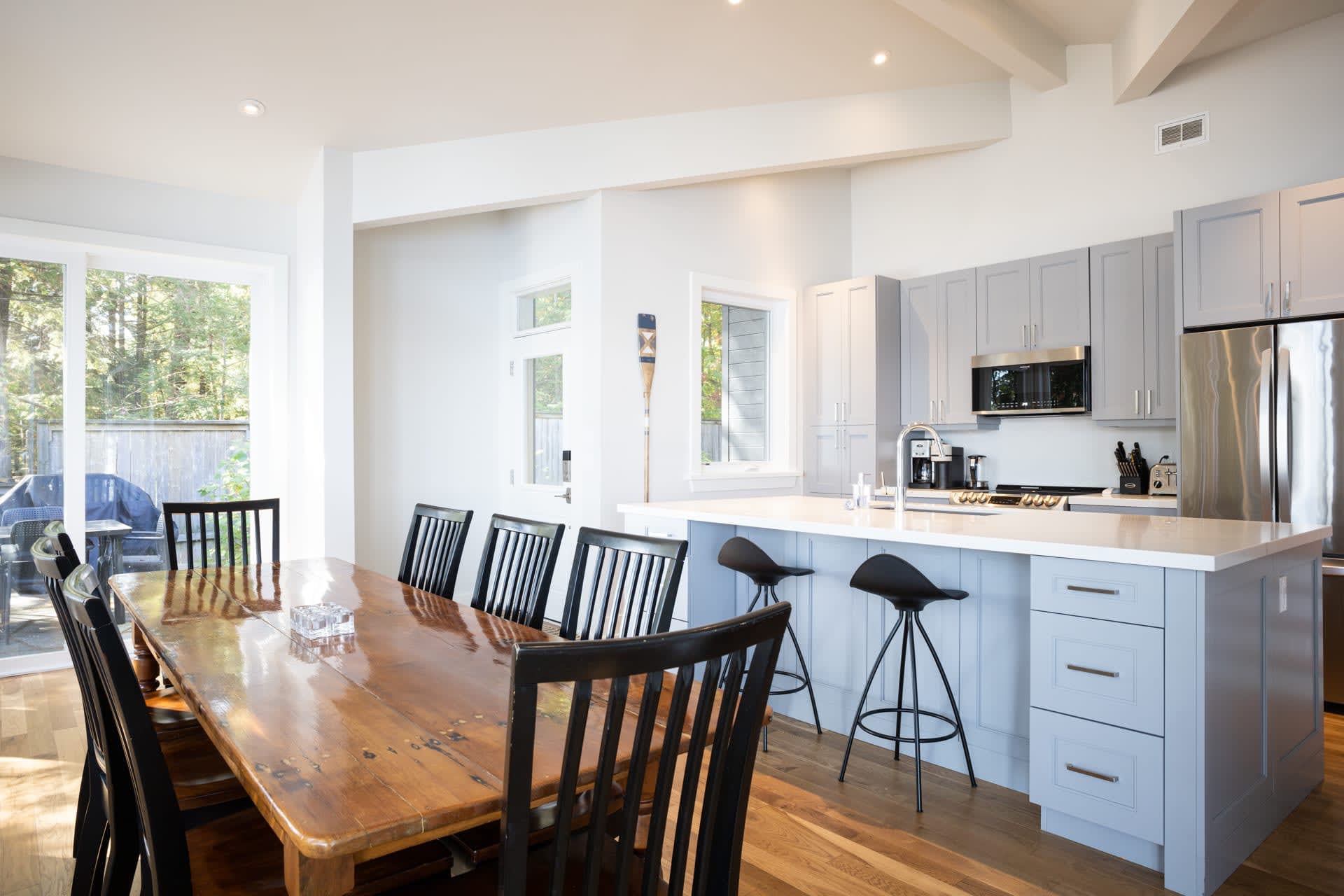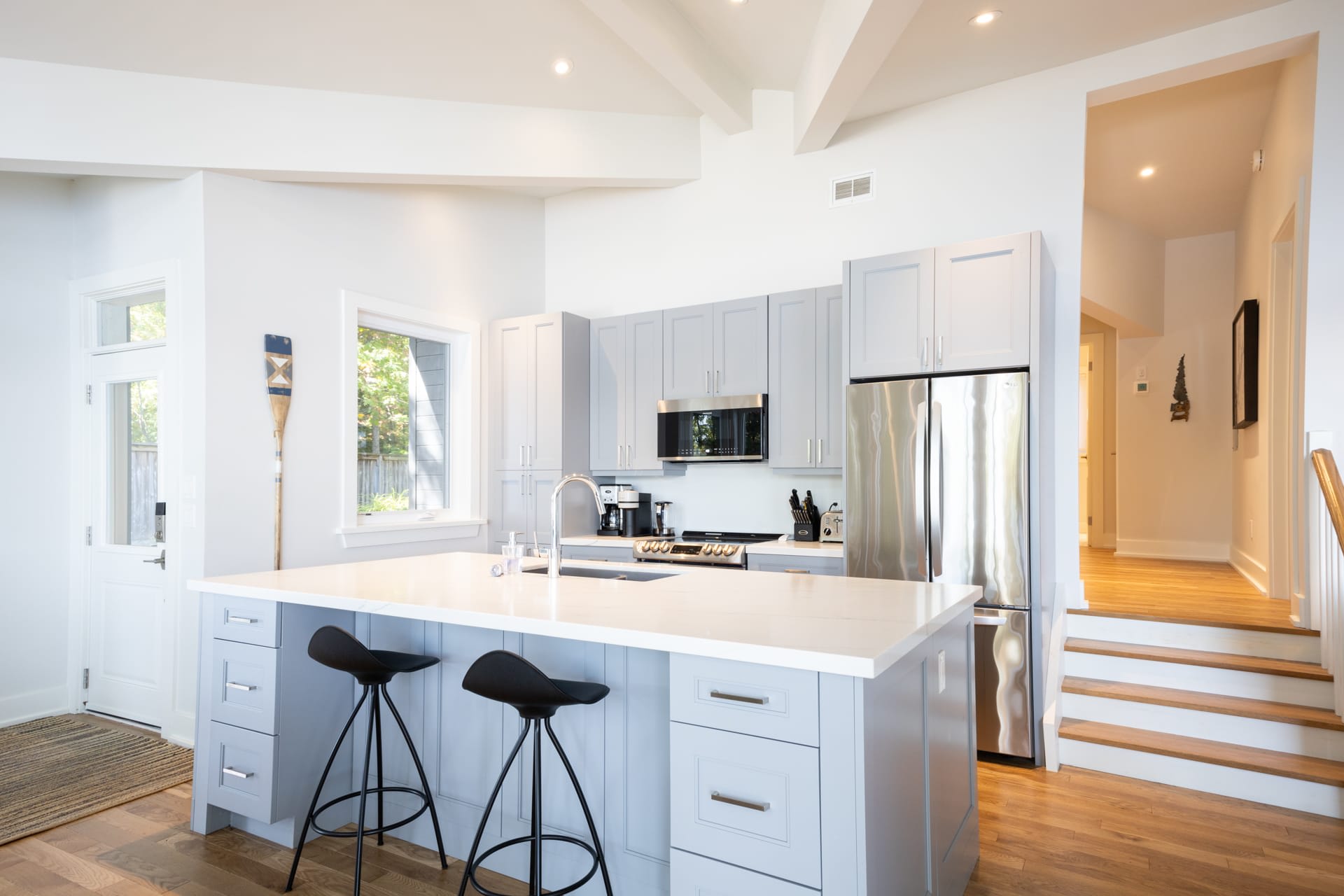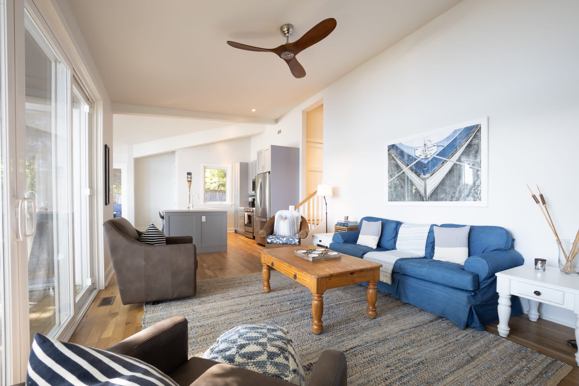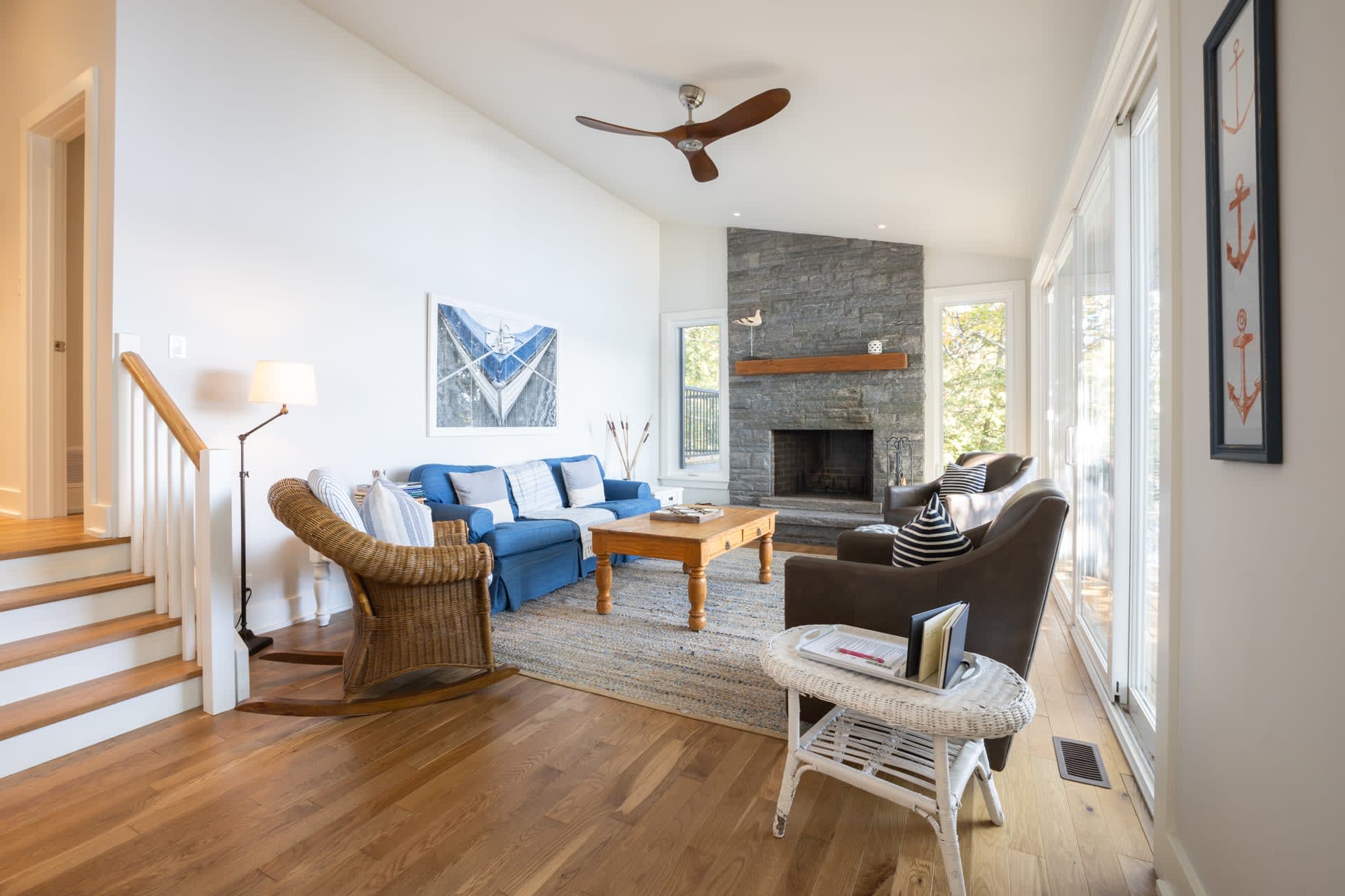 Inside, the cottage opens into a warm and inviting living space, where a wall of windows frames sweeping lake views and fills the home with natural light. A wood-burning fireplace anchors the space, creating the perfect atmosphere for relaxed evenings after a day on the water. The modern kitchen is thoughtfully designed with stainless steel appliances and a large island, making it equally suited for casual family meals or entertaining.