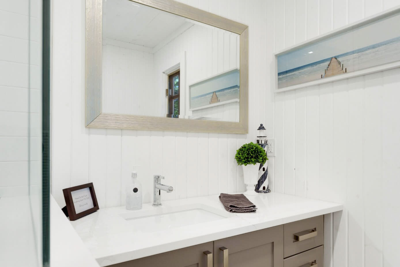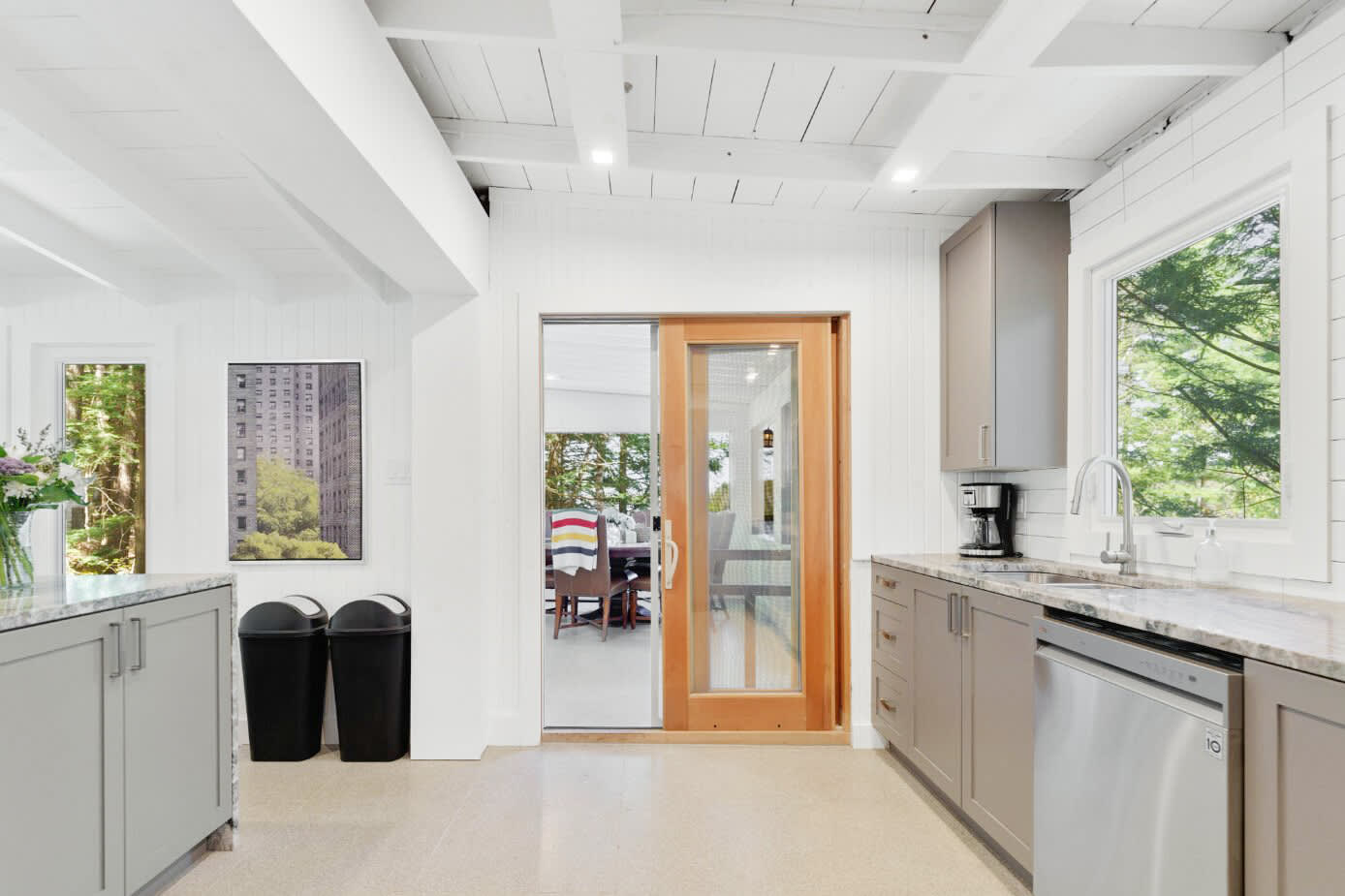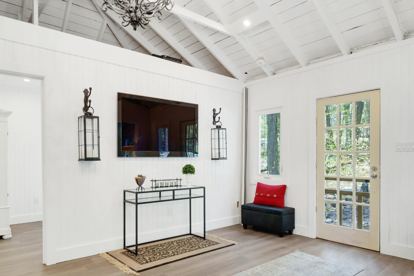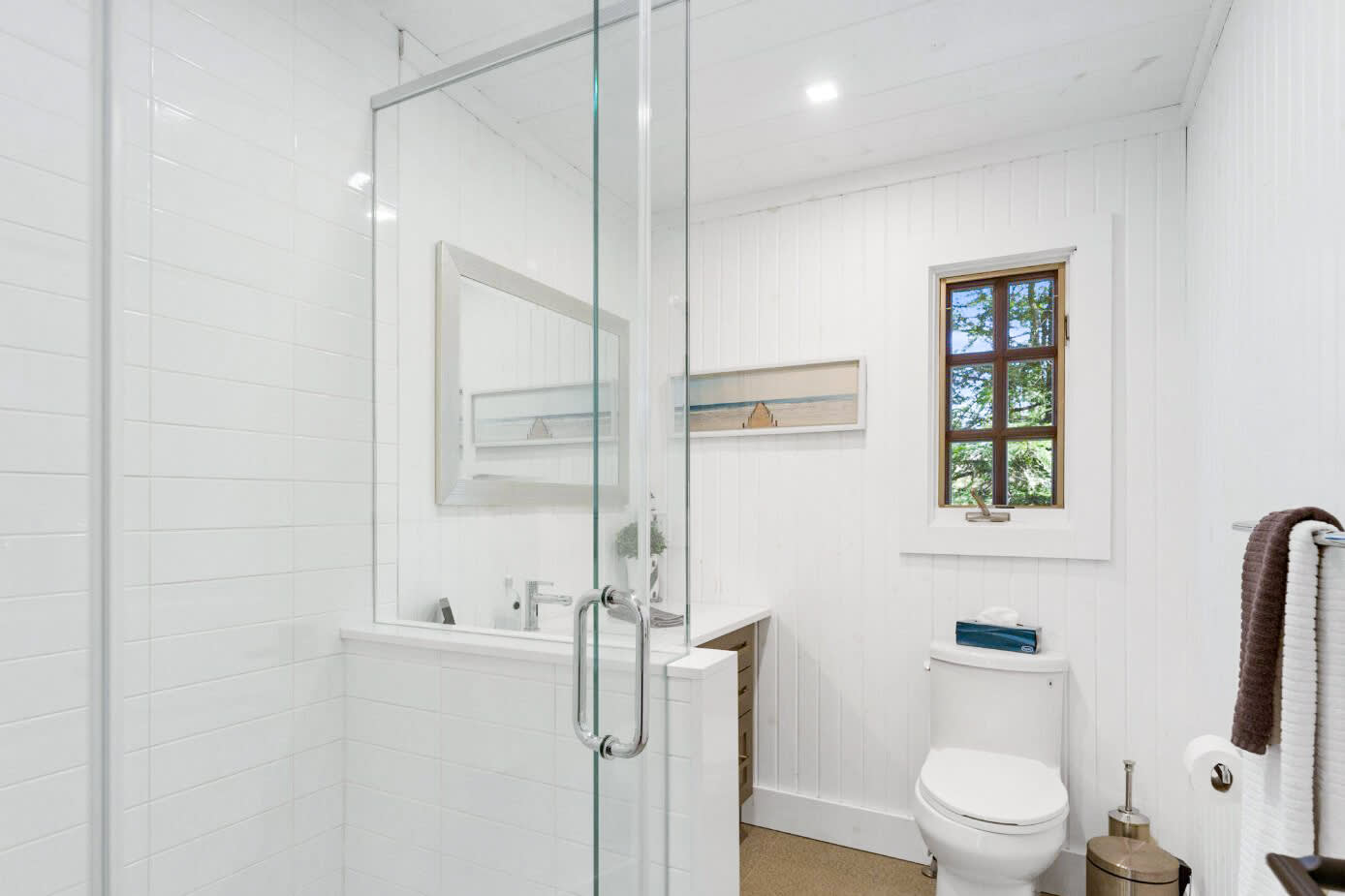 The home features two well-appointed bedrooms in the main cottage, complemented by a private lower-level suite—ideal for guests, extended family, or those seeking additional privacy. Each space is designed to maximize comfort while maintaining the relaxed charm of a true lakeside retreat.