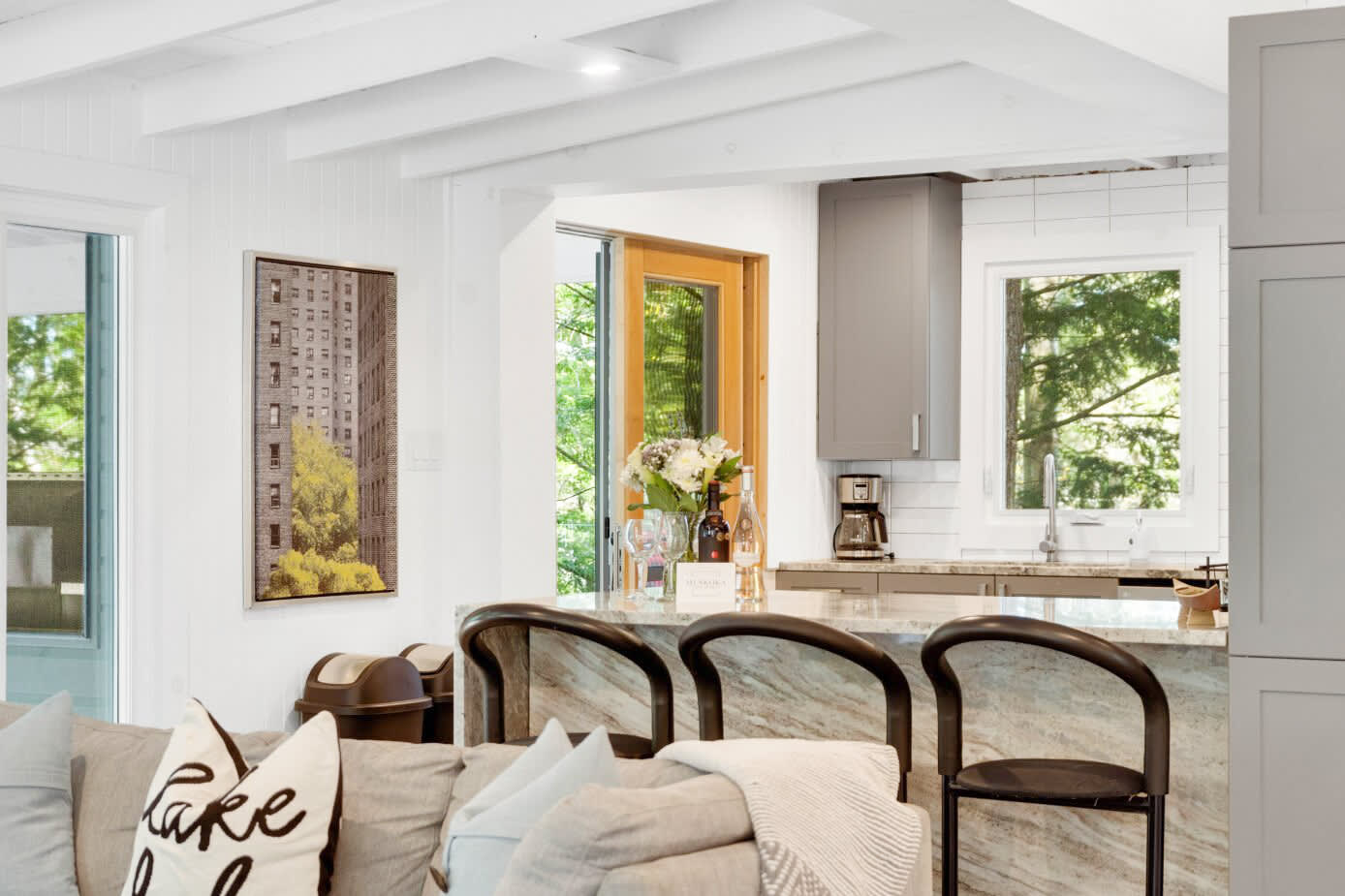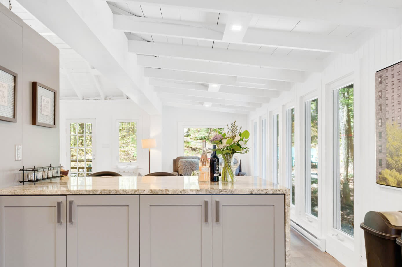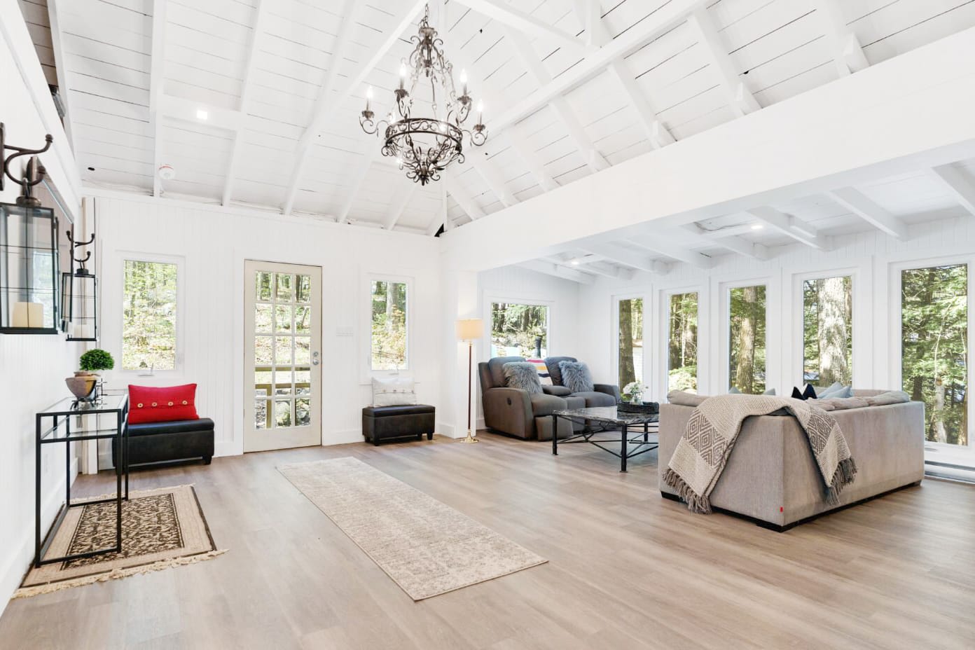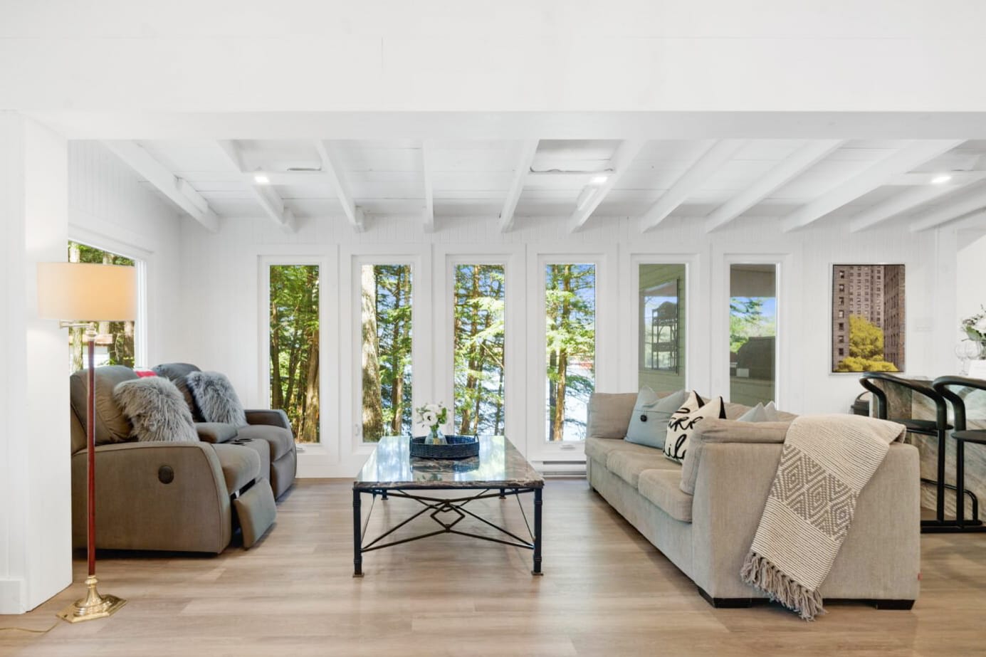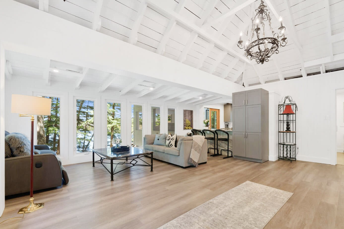 This thoughtfully designed cottage blends classic Muskoka character with modern comfort. The main living space is warm and inviting, featuring cozy furnishings and an open layout that encourages connection—whether gathering after a day on the water or enjoying quiet evenings indoors. A signature Muskoka room provides a peaceful setting to take in panoramic lake views, offering a seamless transition between indoor comfort and the natural beauty that surrounds you.