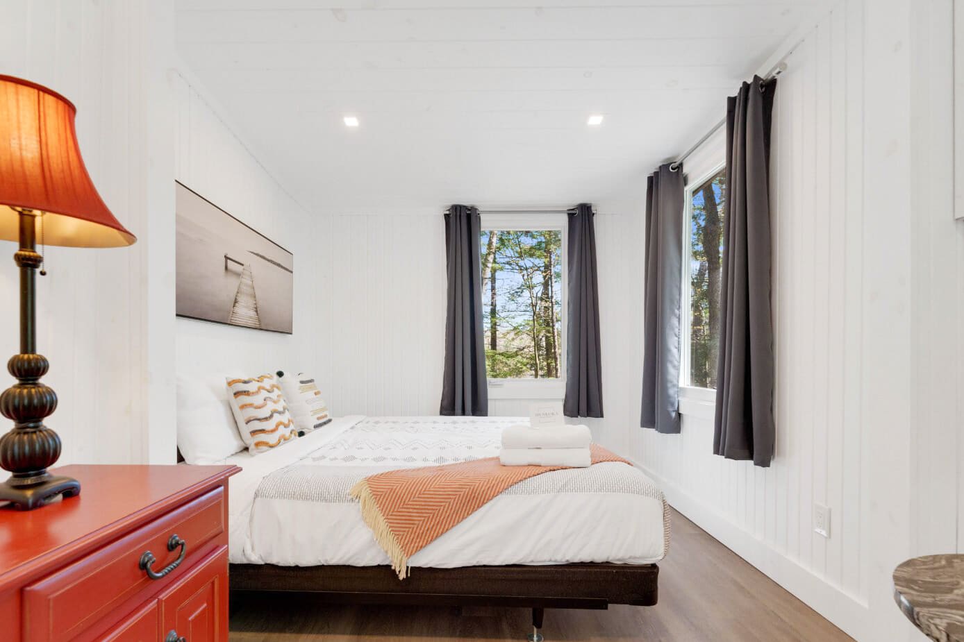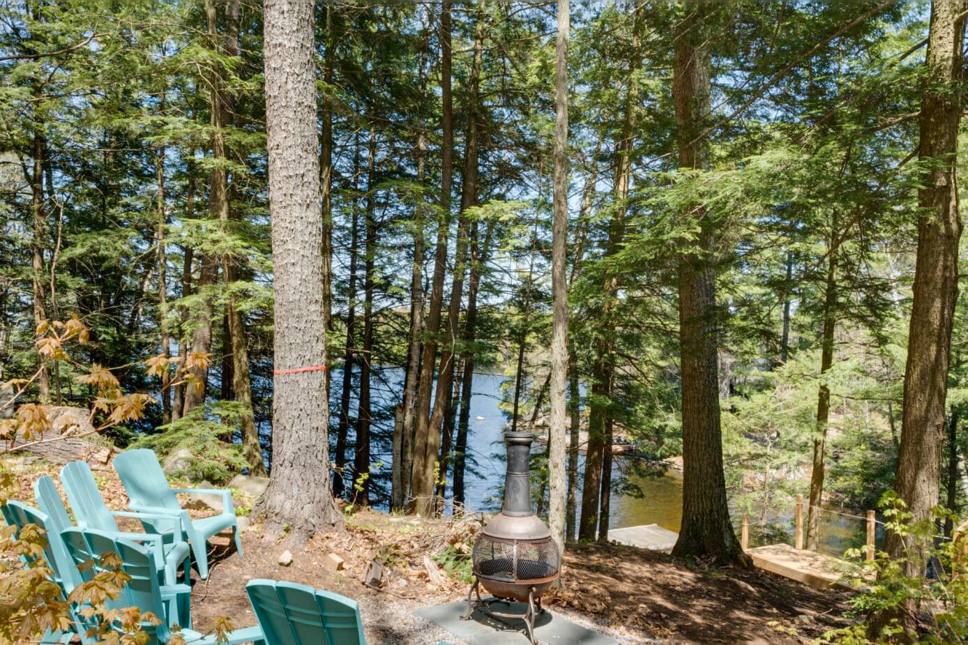 Outdoors, a private dock invites long days spent swimming, boating, or simply enjoying the sun. A natural path leads to the water’s edge, while evenings are best spent gathered around the firepit overlooking the lake—watching sunsets and embracing the quiet rhythm of cottage life.