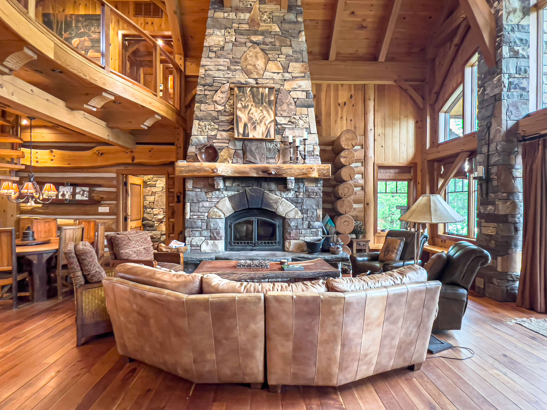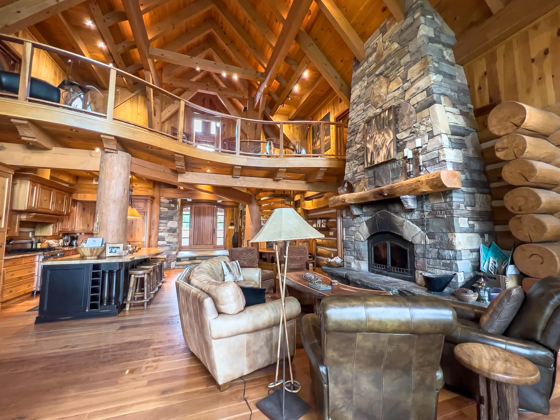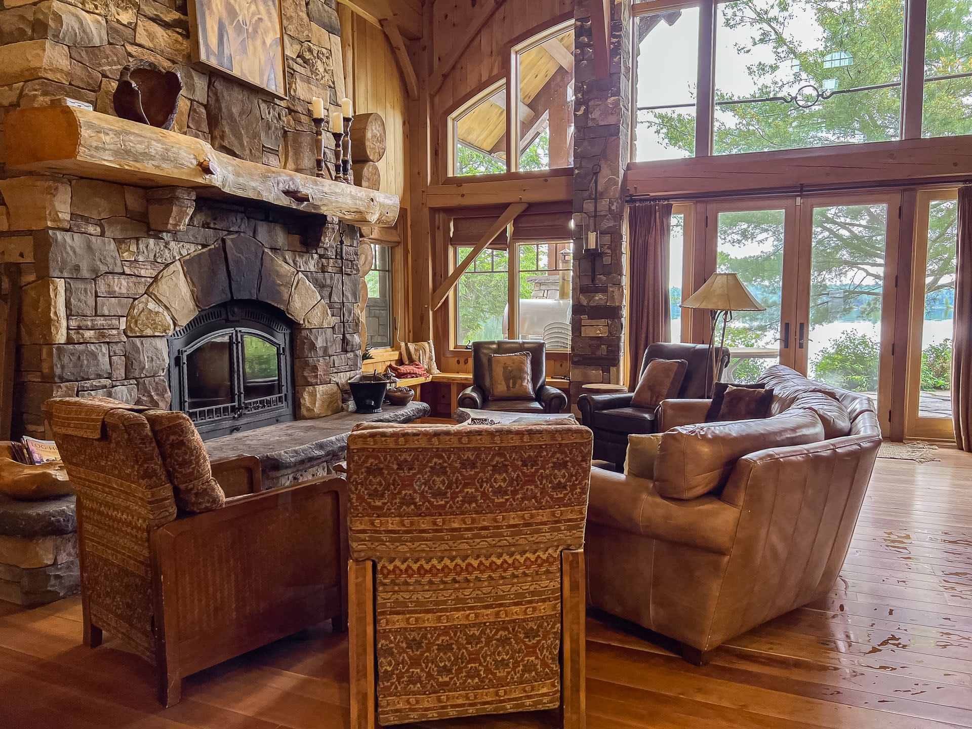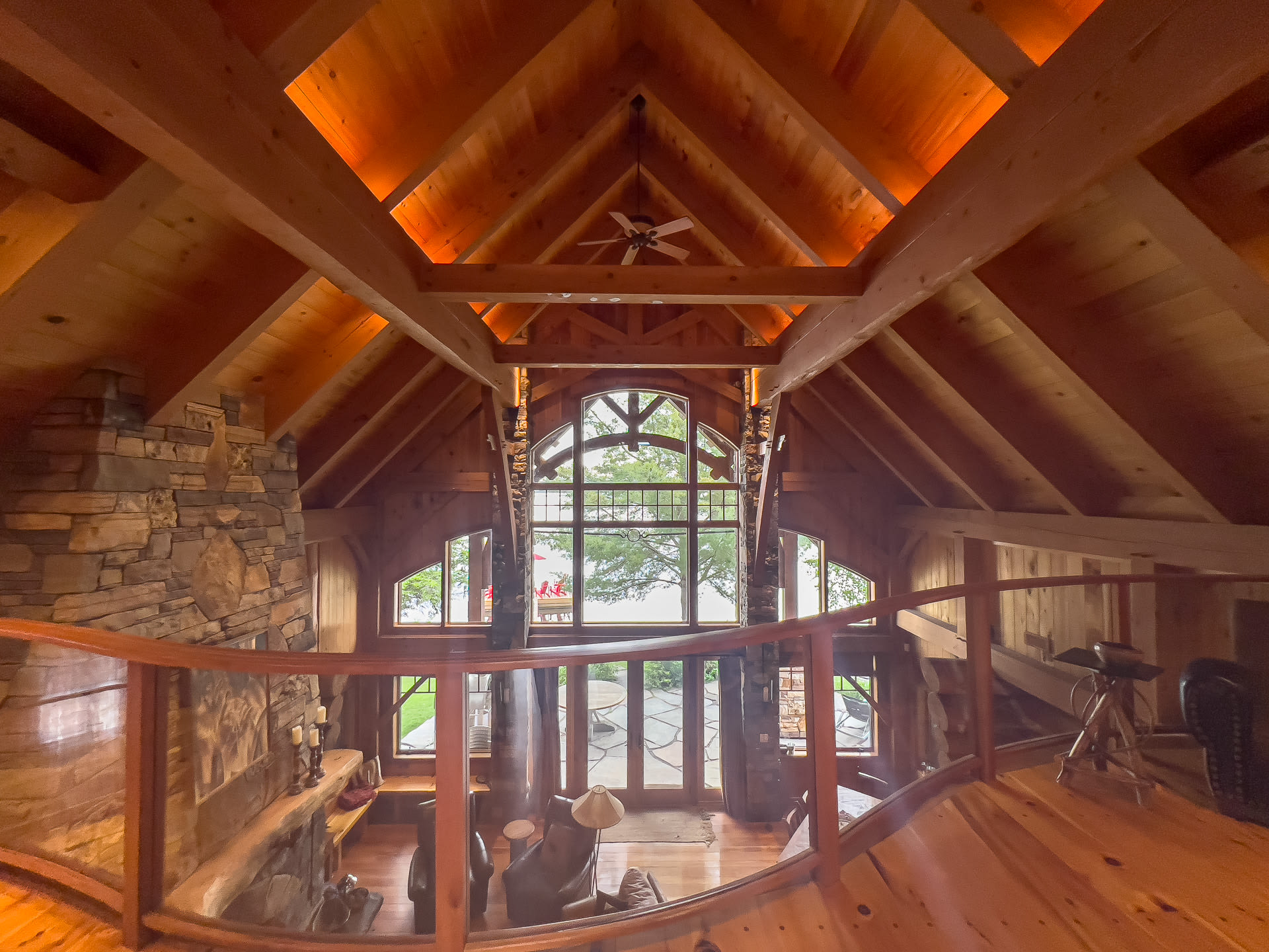Designed as a bespoke executive retreat, the home blends architectural presence with warm, natural materials. A striking timber frame, vaulted ceilings, and a massive stone fireplace anchor the main living space, while expansive windows capture uninterrupted lake views from nearly every angle.