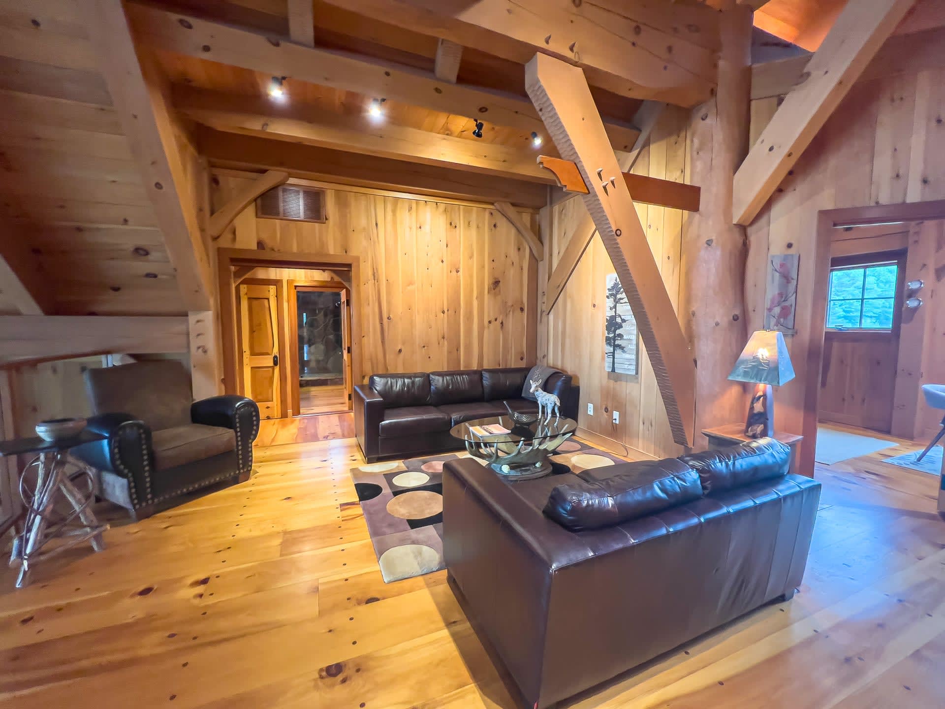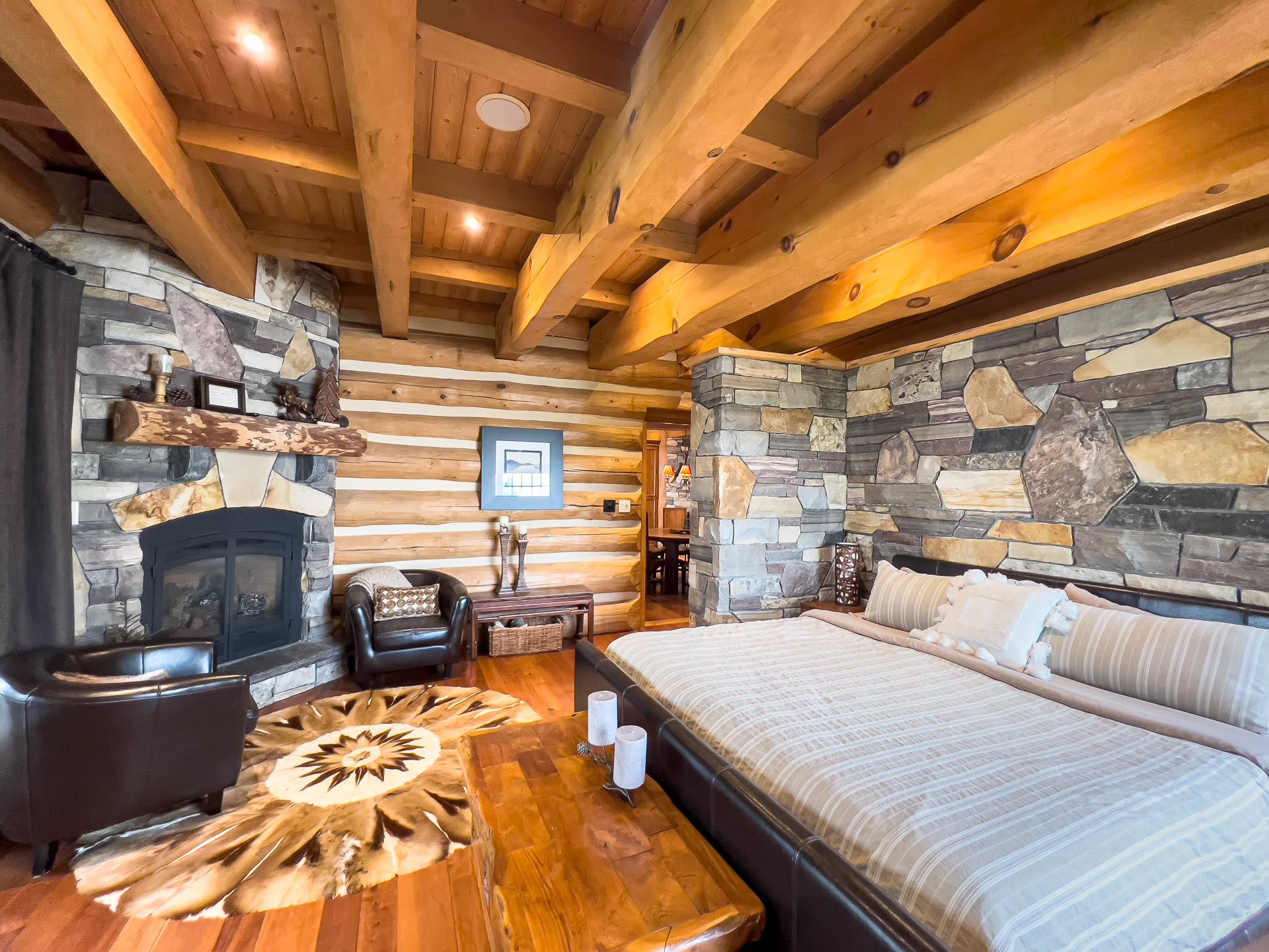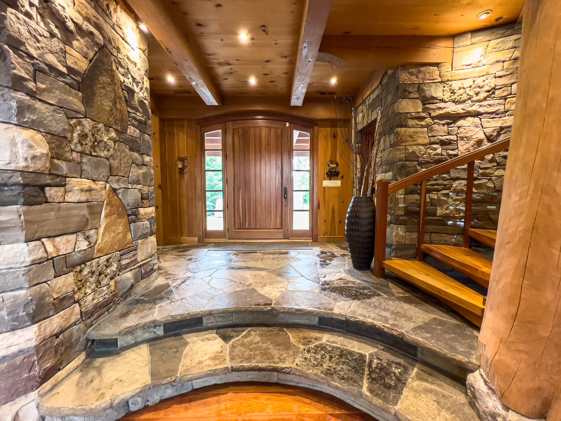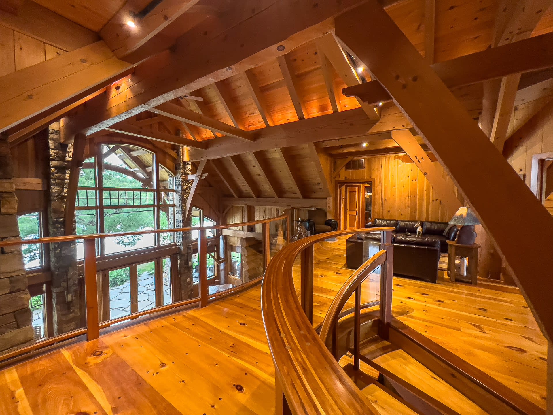 Designed as a bespoke executive retreat, the home blends architectural presence with warm, natural materials. A striking timber frame, vaulted ceilings, and a massive stone fireplace anchor the main living space, while expansive windows capture uninterrupted lake views from nearly every angle.