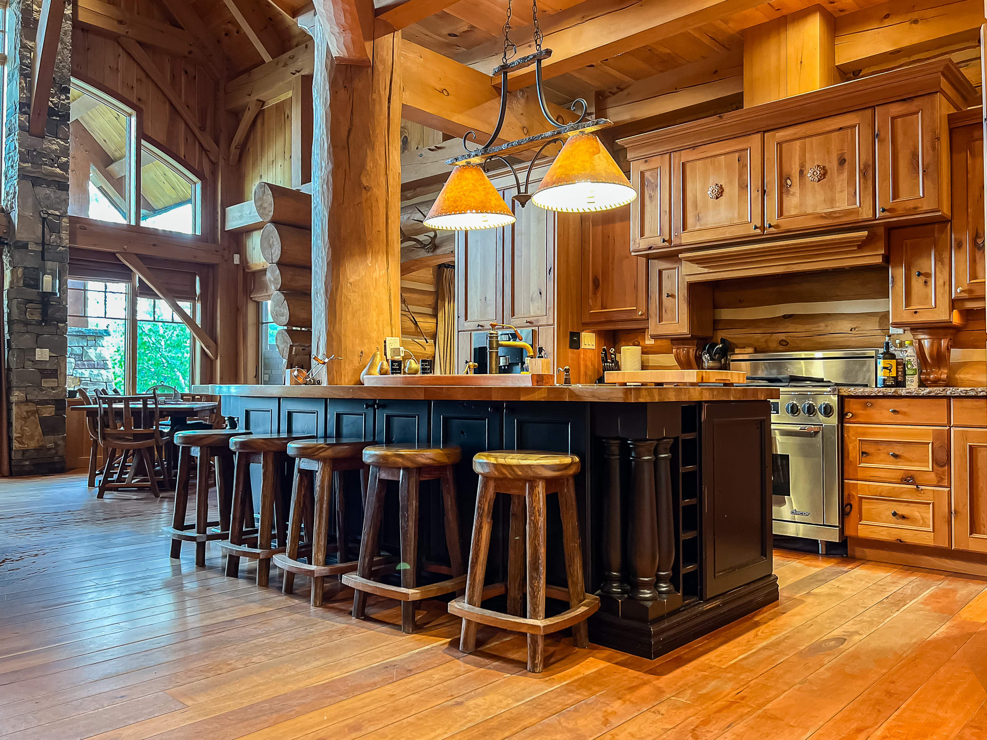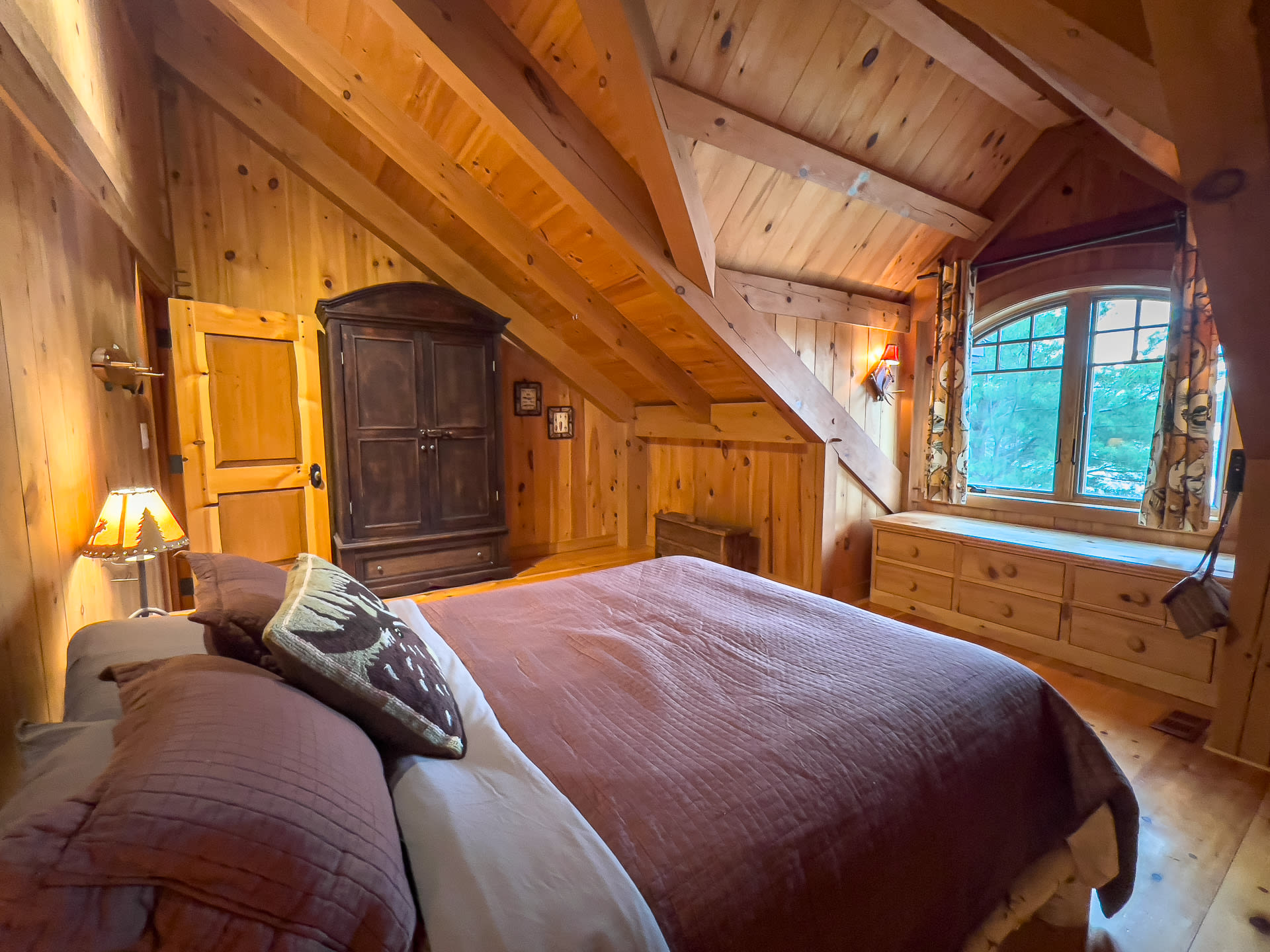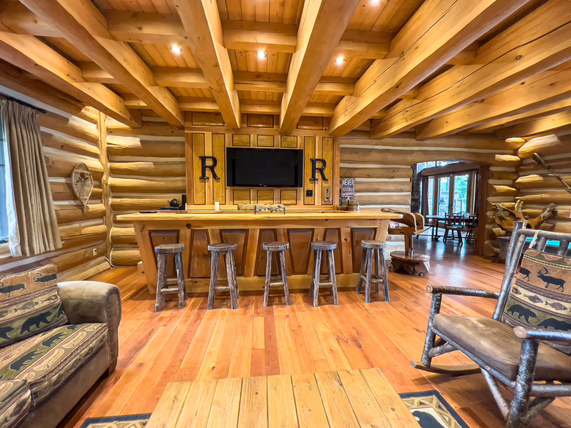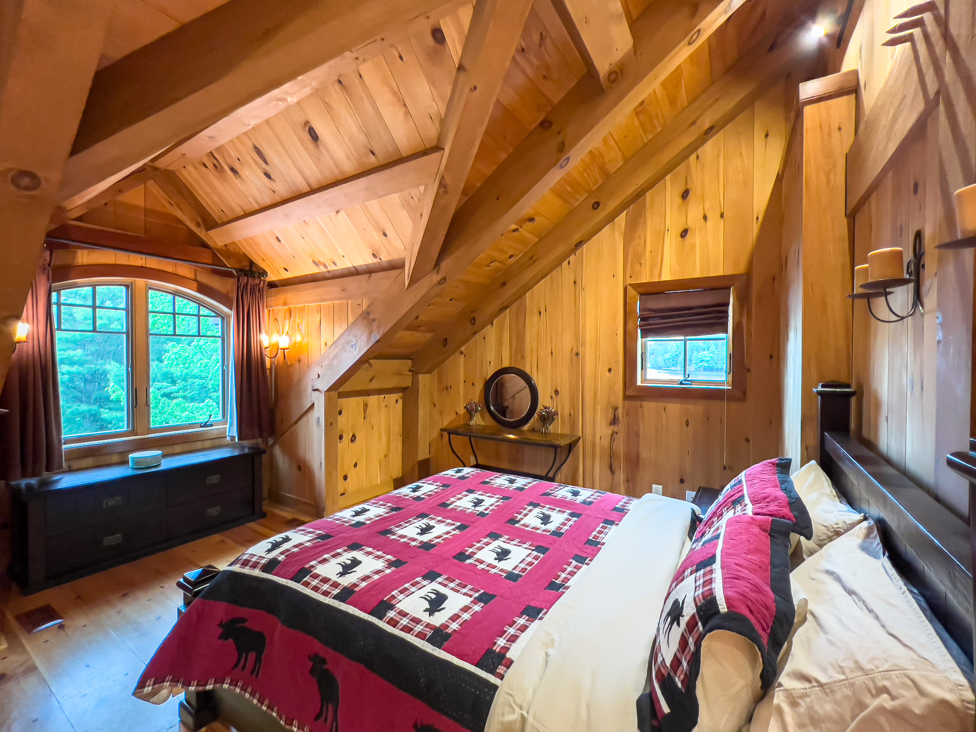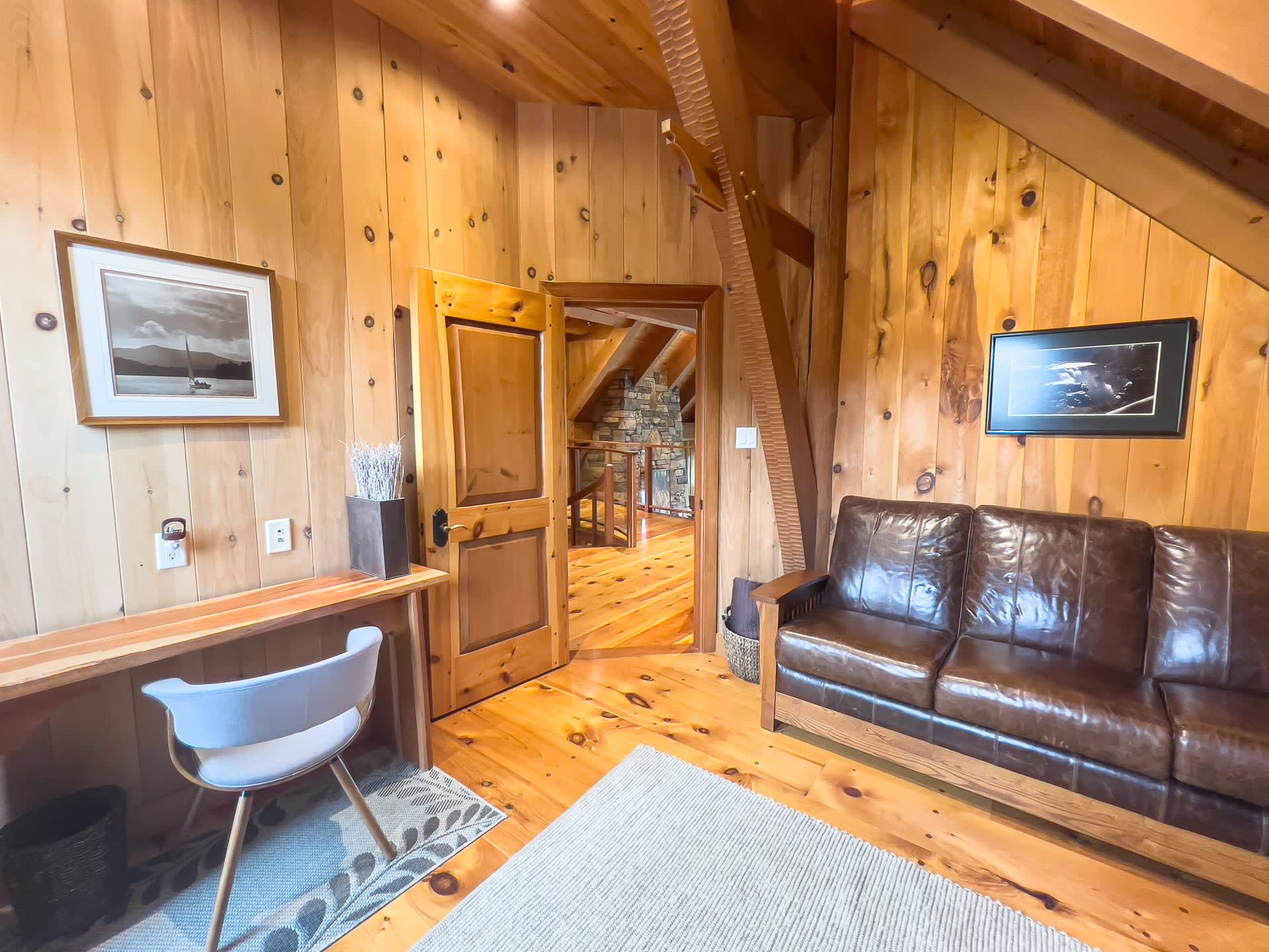 Designed as a bespoke executive retreat, the home blends architectural presence with warm, natural materials. A striking timber frame, vaulted ceilings, and a massive stone fireplace anchor the main living space, while expansive windows capture uninterrupted lake views from nearly every angle.
