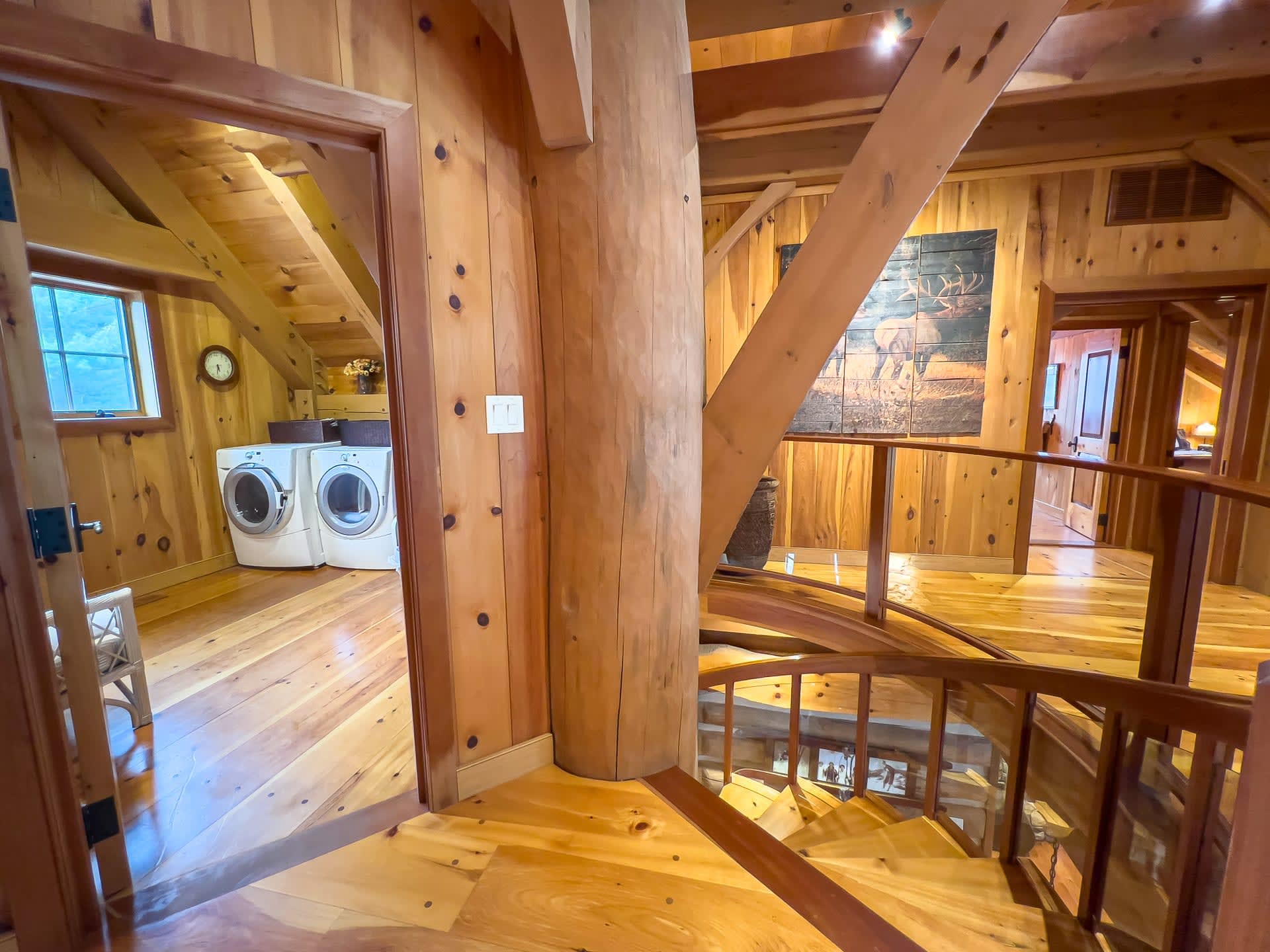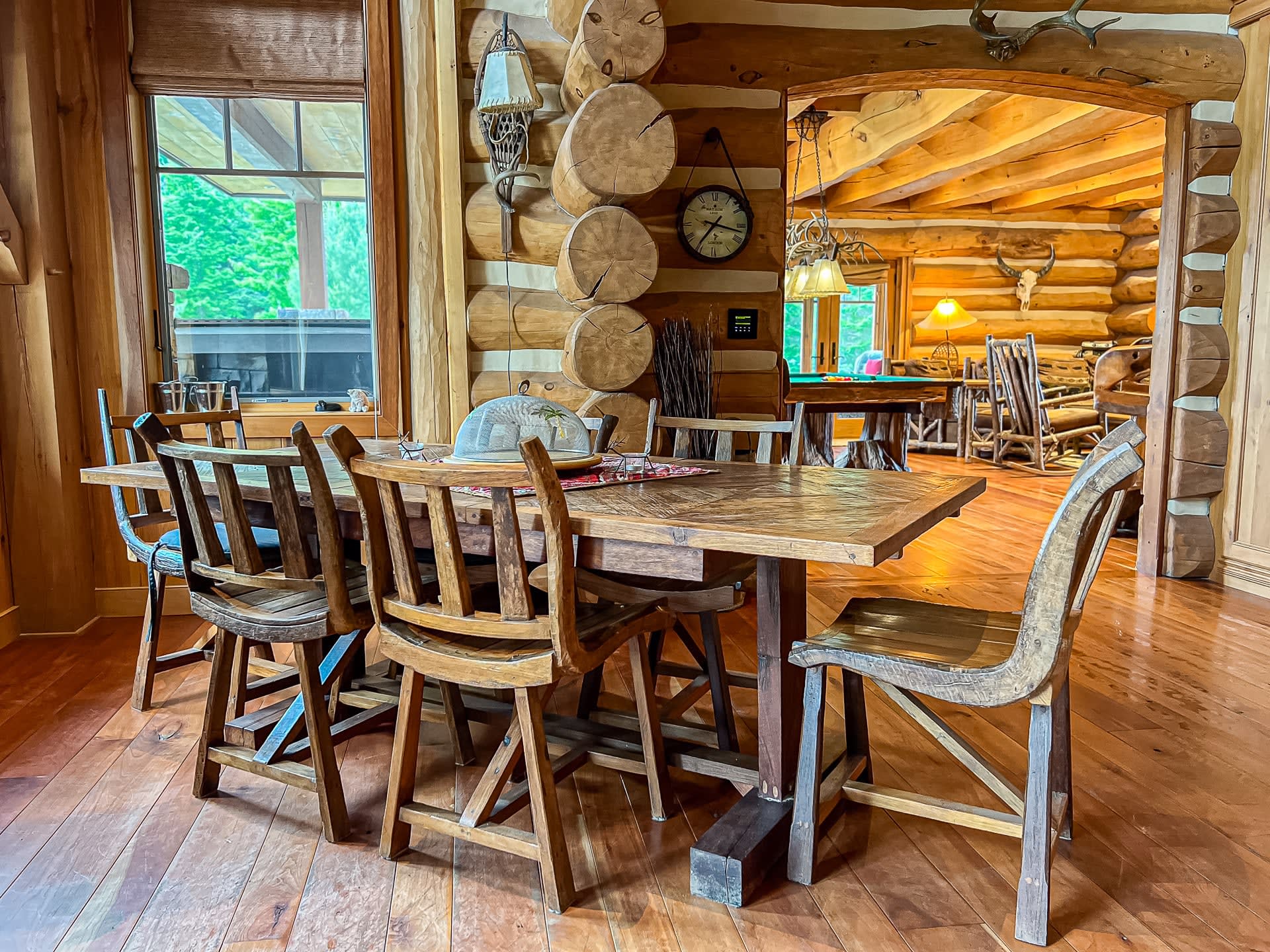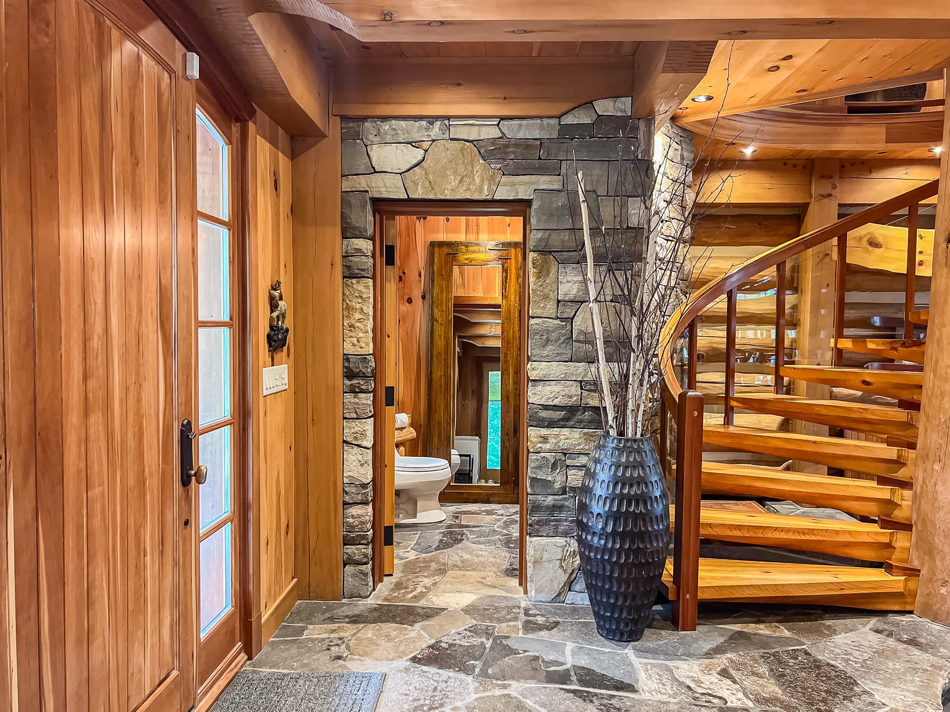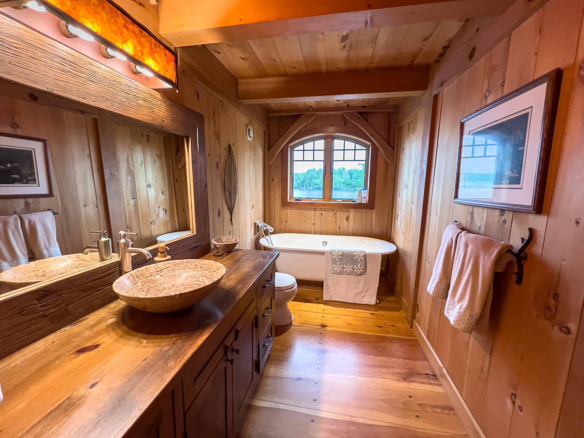 Designed as a bespoke executive retreat, the home blends architectural presence with warm, natural materials. A striking timber frame, vaulted ceilings, and a massive stone fireplace anchor the main living space, while expansive windows capture uninterrupted lake views from nearly every angle.