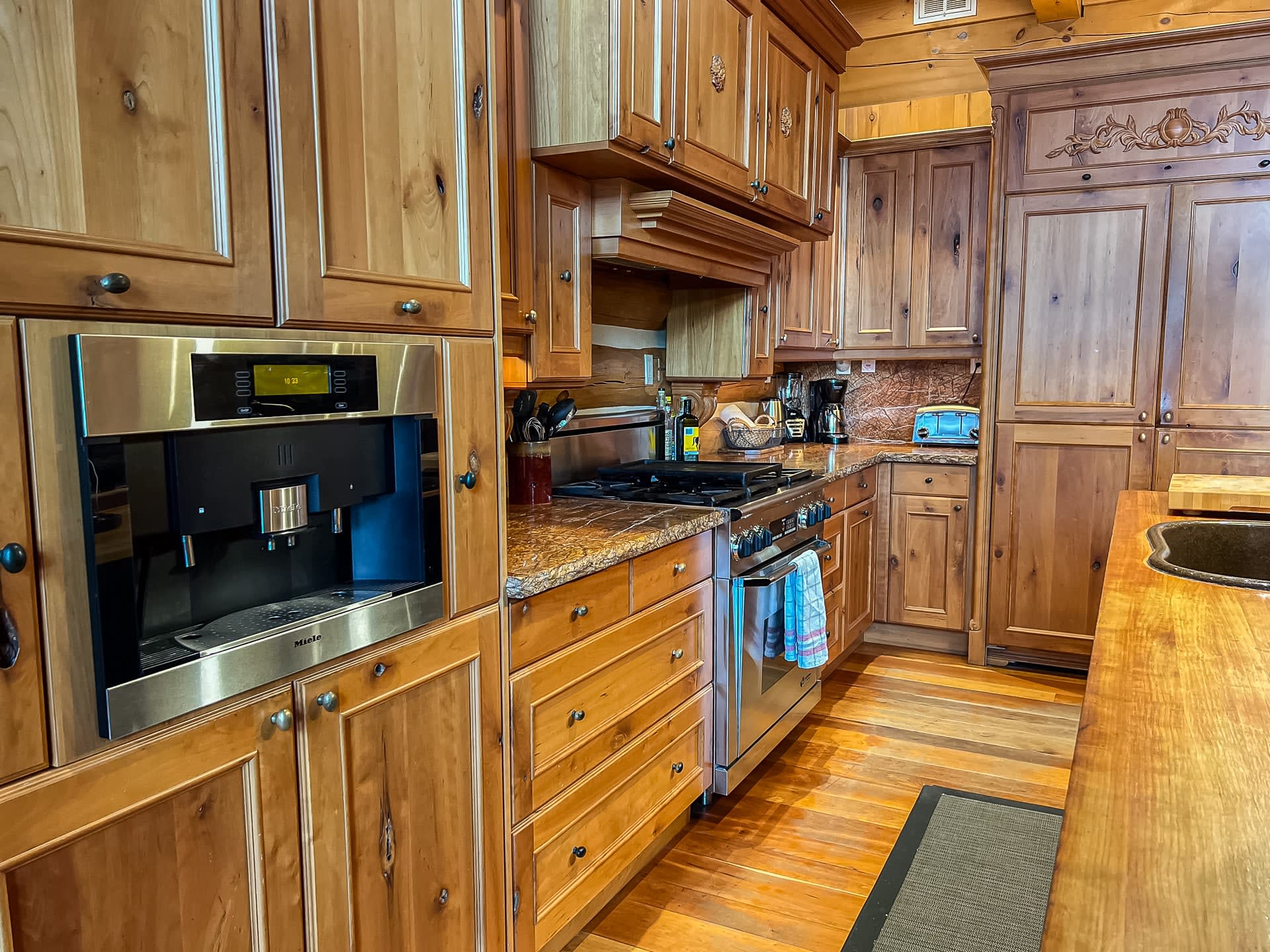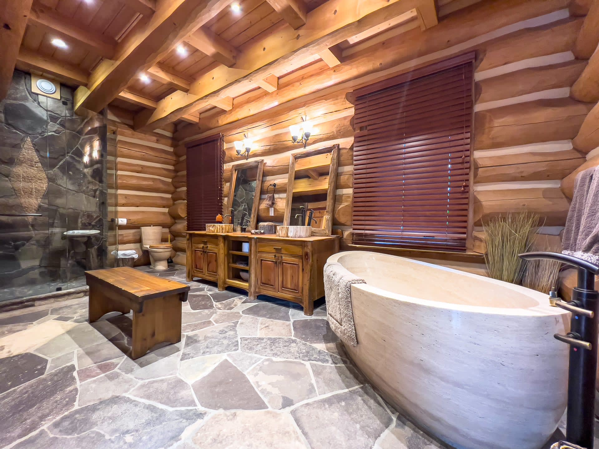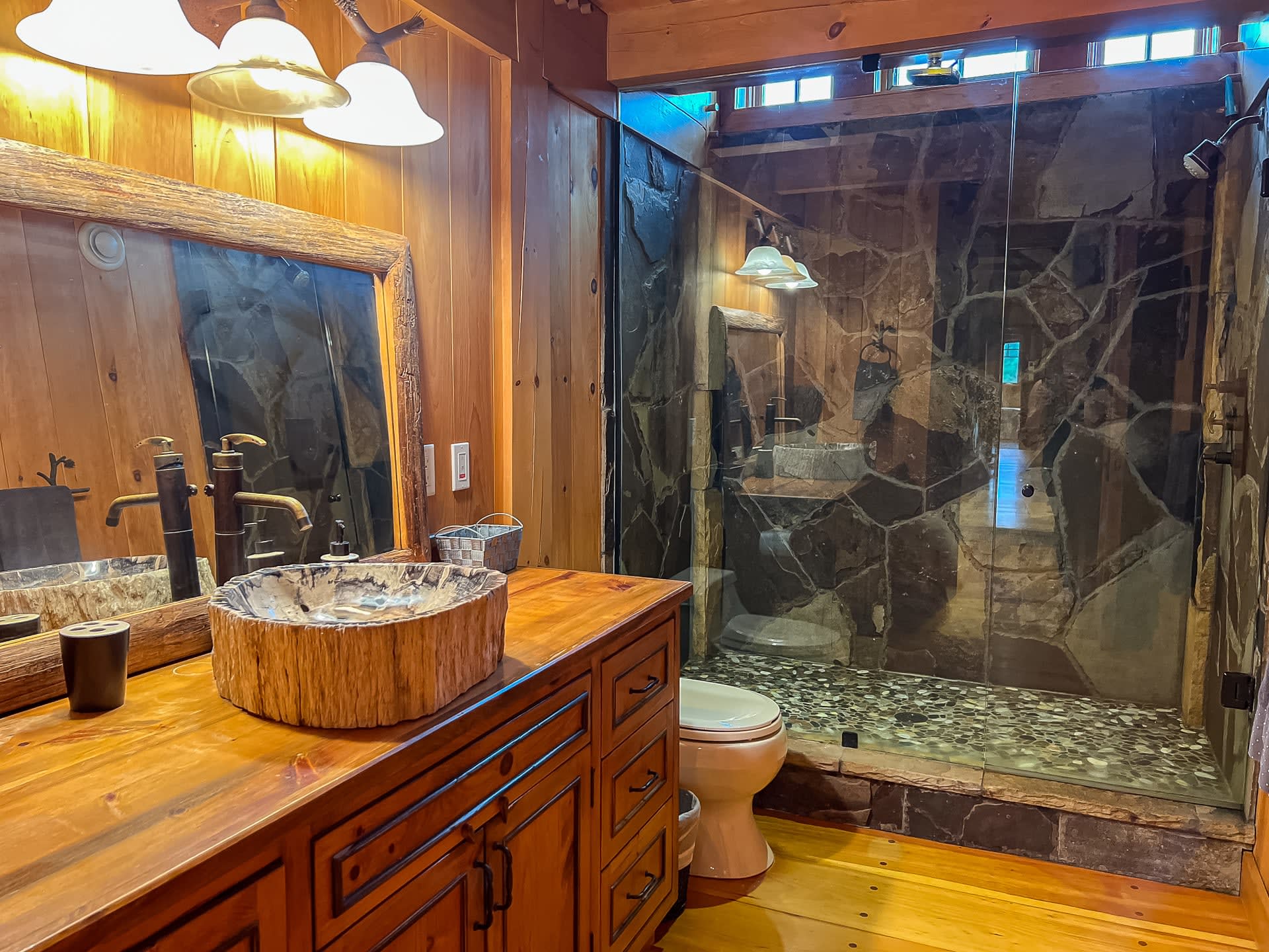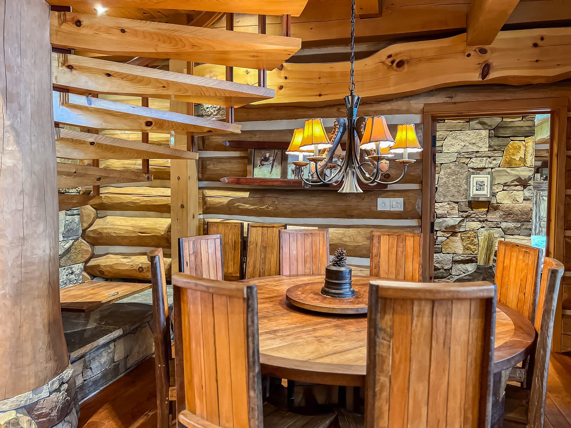 Designed as a bespoke executive retreat, the home blends architectural presence with warm, natural materials. A striking timber frame, vaulted ceilings, and a massive stone fireplace anchor the main living space, while expansive windows capture uninterrupted lake views from nearly every angle.