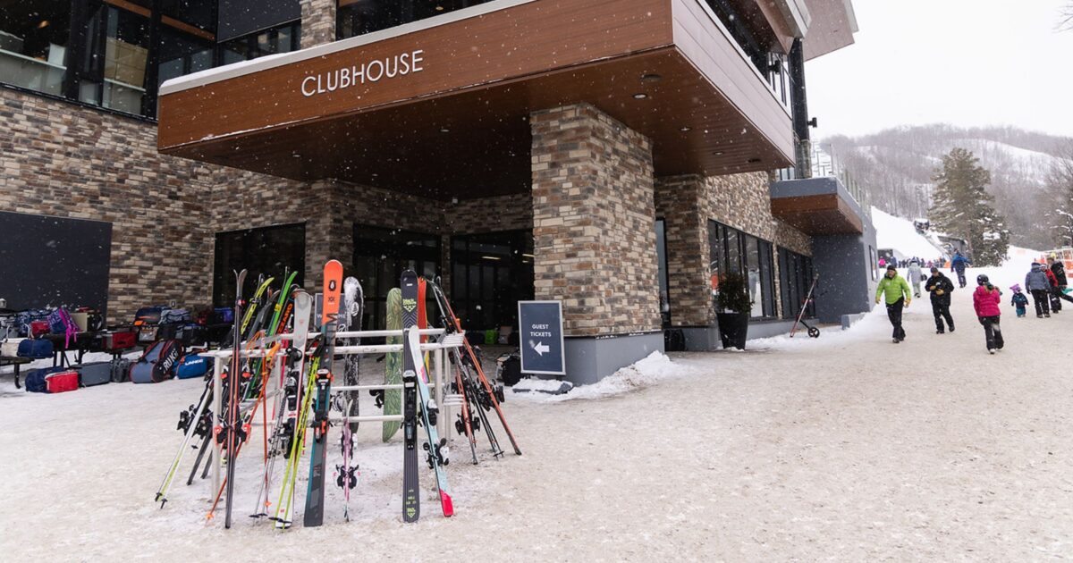 Skis, snowboards, and poles must remain outside, however a boot change and bag storage area is located on the entrance level of the clubhouse to the right as you proceed along the entrance hall.